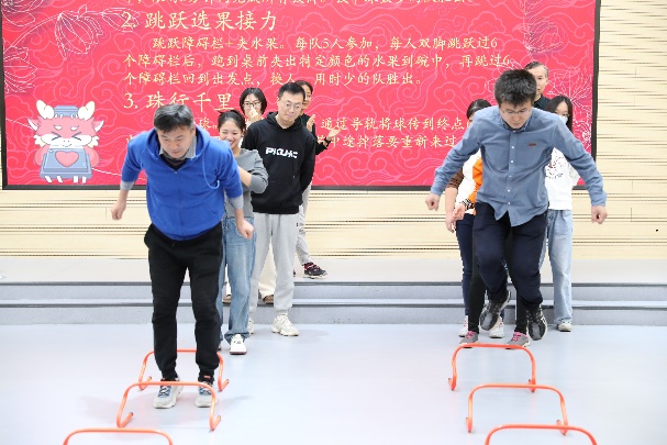 接着进入互动游戏环节。游戏由工会文体委员王媛、姜博岩联手主持,将全体老师分为两队进行比赛。每队15 人,每人至少参加1 个游戏;每队选出1 名队长,由队长分配游戏任务。比赛采用三局两胜制,共设置了乒乓投手、跳跃选果接力和珠行千里三个趣味横生的游戏项目。乒乓投手考验大家的手眼协调能力,老师们精准投掷,展现了不凡的协调与技巧;跳跃选果接力中,大家身手矫健,配合默契,将速度与智慧完美结合;而珠行千里游戏,则更是考验了大家的耐心与团队协作能力,每一颗珠子的顺利传递都凝聚着团队的智慧与汗水。