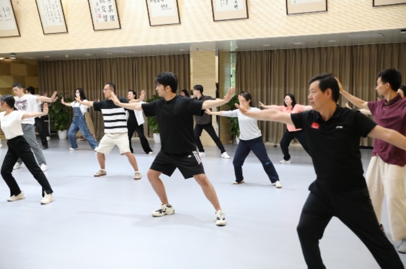 随后,王东敏老师带领大家从充满传统韵味的热身活动开始,几个“缠丝功”的基本动作过后,迅速起到舒缓预热、充分拉伸的效果。接着,王老师对八段锦每一式的动作进行了透彻分解及示范,针对大家的动作细致纠正,现场的每一位参与者都全神贯注地聆听着,仿佛打开了一扇通往健康与宁静的大门。最后,随着悠扬的音乐声响起,大家跟随八段锦的口令音乐进行磨合练习,完整领略整套八段锦动作神形合一的独特魅力,充分体会健康生活的真谛与乐趣。