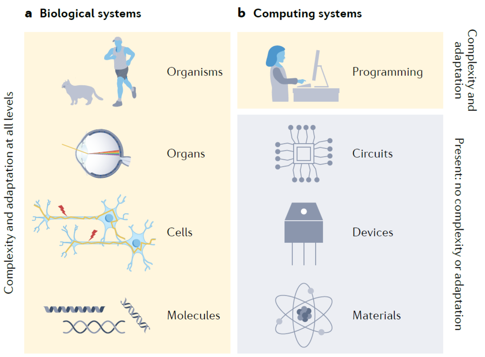 近年来,通过存算一体、类脑计算等新型计算范式构建具有高效智能计算芯片与系统已经取得了显著进展。然而,在现有计算系统下全部智能、复杂性、适应性都是由软件编程(事实上是编程的生物智能体-人)所赋予的,器件、电路本身均不具备任何复杂性与适应性。与之相比,生物系统展示出了分子、细胞、系统等多层次、全方位的智能、复杂性与适应性,对于发展新一代智能、高效计算技术具有重要启发意义。
