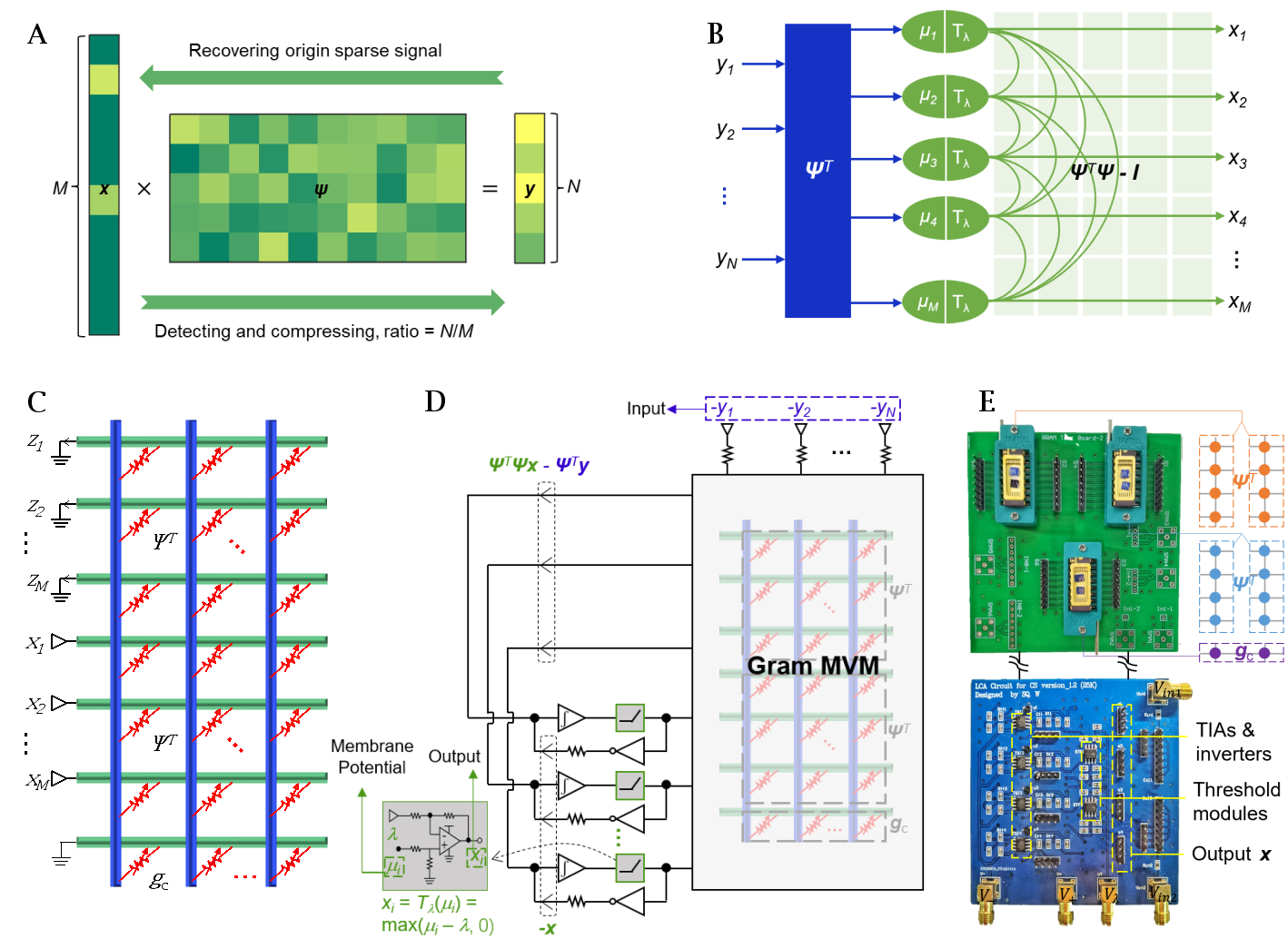 为了解决该问题,研究团队首先设计了一种一步实现矩阵-矩阵-向量乘法(MMVM)的模拟存内计算单元,从而避免了矩阵乘法的预计算操作。进一步地,团队从求解的动力学方程出发,将该单元与其它模拟元件连接形成反馈回路,准确地映射了相应的算法,实现了无需预计算、无需迭代的一步求解压缩感知还原。