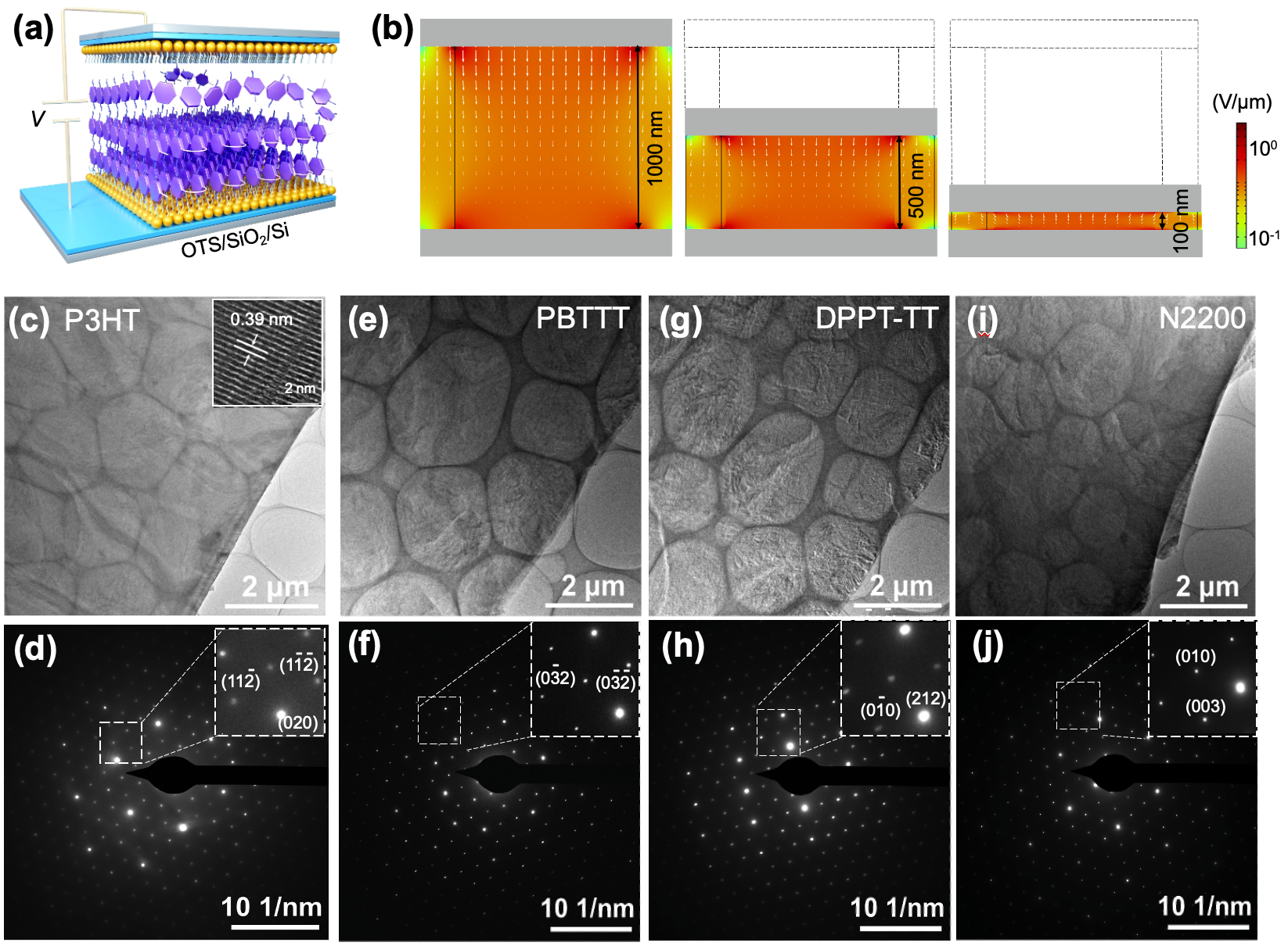 首先,研究团队利用第一性原理计算,以典型共轭聚合物P3HT为例,模拟在基底自组装诱导和取向电场极化诱导双重限域条件下,P3HT分子链克服扭转势能形成平面链结构的动力学过程(图1a-b);进一步仿真结果表明,这种双重限域诱导对于分子结构更加复杂的PBTTT、DPPT-TT和N2000同样有效,具有广泛的通用性(图1c-f)。