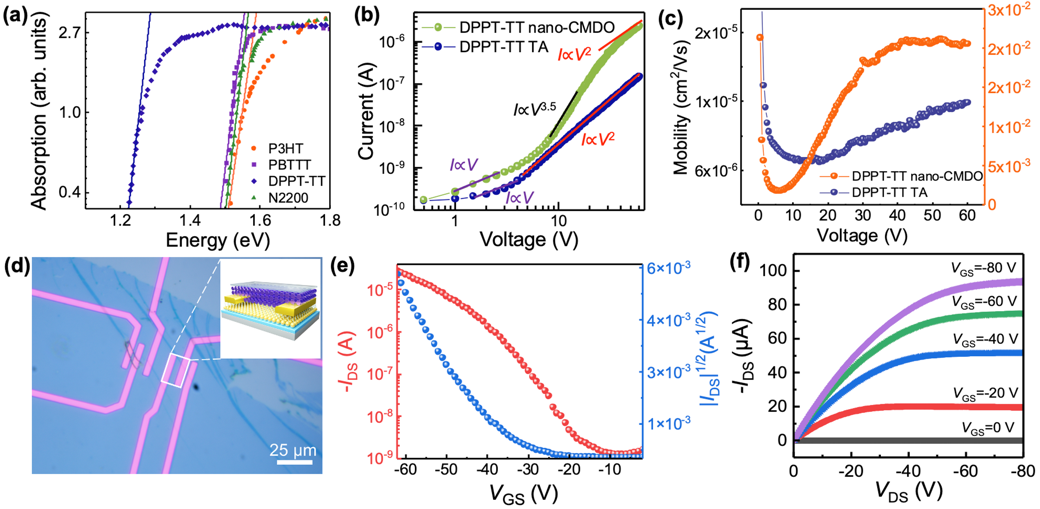 在此基础上,研究团队研究了nano-CMDO制备的共轭聚合物单晶薄膜的电学特性(图3)。光热偏转光谱结果表明,所有共轭聚合物单晶薄膜的Urbach能量均为当前文献报道的最低值,其中N2200单晶薄膜的Urbach能量低至25 meV;此外,共轭聚合物单晶薄膜SCLC器件表现出接近理想状态的电荷输运行为;最后,通过优化有机半导体薄膜场效应晶体管制备工艺,DPPT-TT单晶薄膜的晶体管迁移率达到15.5cm2V-1s-1,为其在高性能有机电子器件方面的应用奠定了坚实基础。