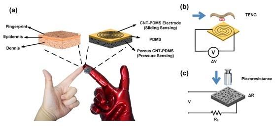 课题组以人类指纹结构为突破口,以人体皮肤传感机制和结构为启发,通过研究皮肤传感生理机制和手指生理结构,创造性地将摩擦式动态传感与压阻式静态传感加以结合,设计了一种新型基于指纹结构的多功能电子皮肤;模仿指纹结构设计双螺旋电极的摩擦发电机,通过摩擦电压输出频率检测滑动物体的粗糙度,首次提出了数字式的摩擦检测方案;模仿真皮结构制备多孔碳纳米管/聚二甲基硅氧烷(CNT-PDMS),通过接触电阻变化检测压力大小,合理调控纳米导电网络及多孔率,可大幅提升压阻传感灵敏度。同时集成动态滑动检测和静态压力检测的功能,体现了该多功能电子皮肤在执行复杂任务的强大能力,显示了其在机器人传感领域的巨大潜力。