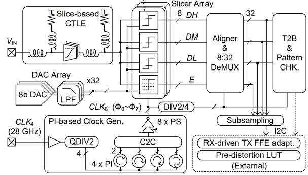 团队提出了一种多单元CTLE电路,可以同时取得较高的增益和较小的调节步长,实现了高于59GHz的模拟带宽;此外,通过提高CTLE的峰值频率减小了群延迟的波动,降低对FFE抽头数量的要求,仅使用三抽头就能在13.6dB衰减信道下实现8.1e-7的误码率;还提出了一种基于相位插值器及非线性预失真的八相位时钟产生电路,在不使用注入锁定环形振荡器的条件下,产生八相位14GHz时钟,相位误差低于3.6度。基于上述技术,研究团队使用12nm工艺流片验证了一款224Gb/s极短距接收机芯片,实现了当前模拟接收机的最高速率;能耗仅为1.11pJ/b,优于3nm工艺的数字接收机。