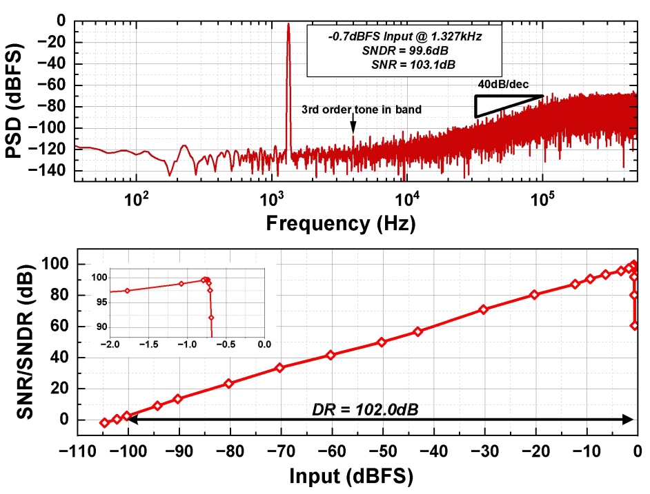 基于上述架构和电路层面的创新,研制了一款基于55nm CMOS工艺的高精度高能效的模数转换器系统芯片。在55nm工艺下,该芯片在40MS/s的采样率下实现了82.9dB SNDR的精度,105.4dB SFDR的线性度和1.12mW的功耗,在所有采用轨到轨驱动的模数转换器系统中达到了最高的轨到轨信号线性度(105.4dB SFDR)和有竞争力的能效(176.3dB FoMs)。该电路具有高精度(>80dB),高线性度(>100dB),中等带宽(~MHz),高能效等特点,可广泛应用于物联网,传感器前端与工程测量等应用中。