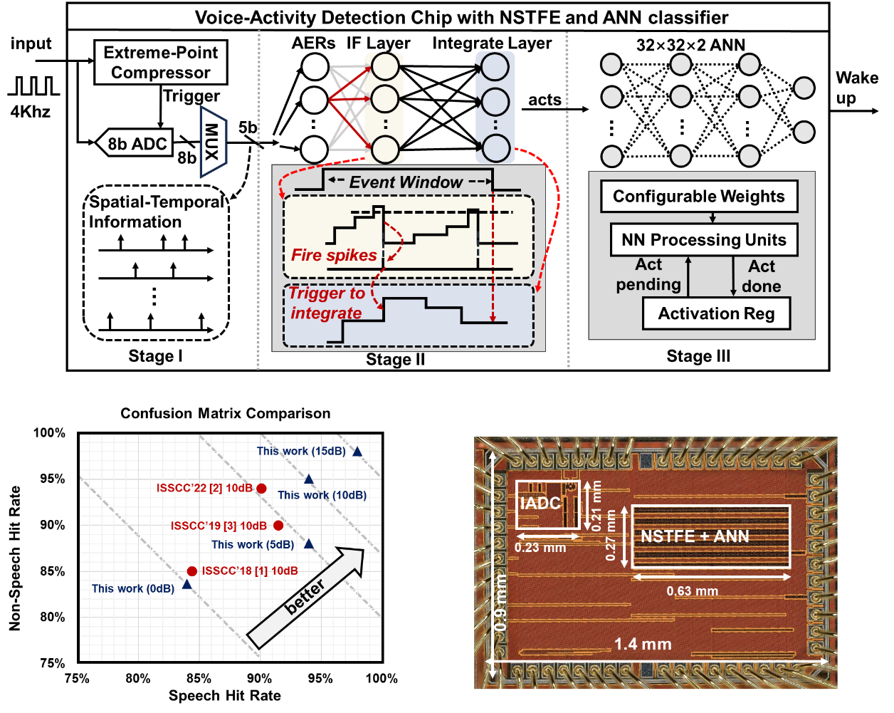 该工作面向边缘AIoT设备应用,针对语音活动检测(VAD)系统在功耗、噪声鲁棒性及准确性方面的综合性能瓶颈,设计并实现了一款基于信息感知数据压缩与神经形态时空特征提取的超低功耗VAD芯片,突破了传统方案中功耗与精度无法折中的技术局限。