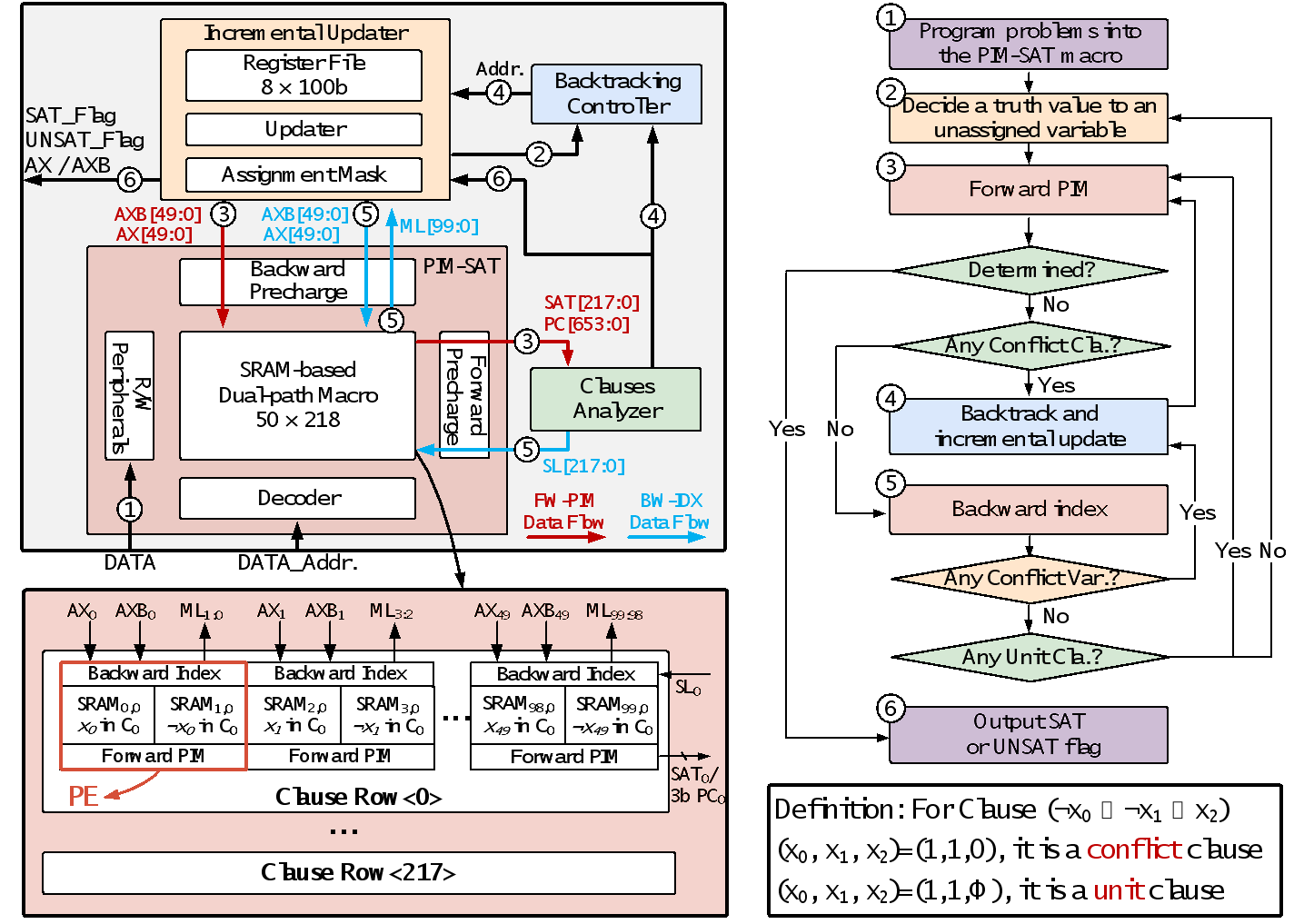团队提出首款支持完备性验证的K-SAT专用集成电路求解器SKADI,通过硬件架构创新确保解空间的穷尽性探索。提出的SKADI架构具有两个核心特征,分别是dual-path SRAM-based macro单元与incremental updating策略:前者通过前向计算和后向检索实现了高效的子句-文字双向推导,而后者采用路径回溯压缩技术达成历史赋值信息核心节点的线性存储。在28nm工艺节点上,该设计以0.2mm²的核心面积实现硬件级完备性验证,针对uf50-218标准算例达成平均17.1μs的求解时间,运行功耗稳定在3.39mW。