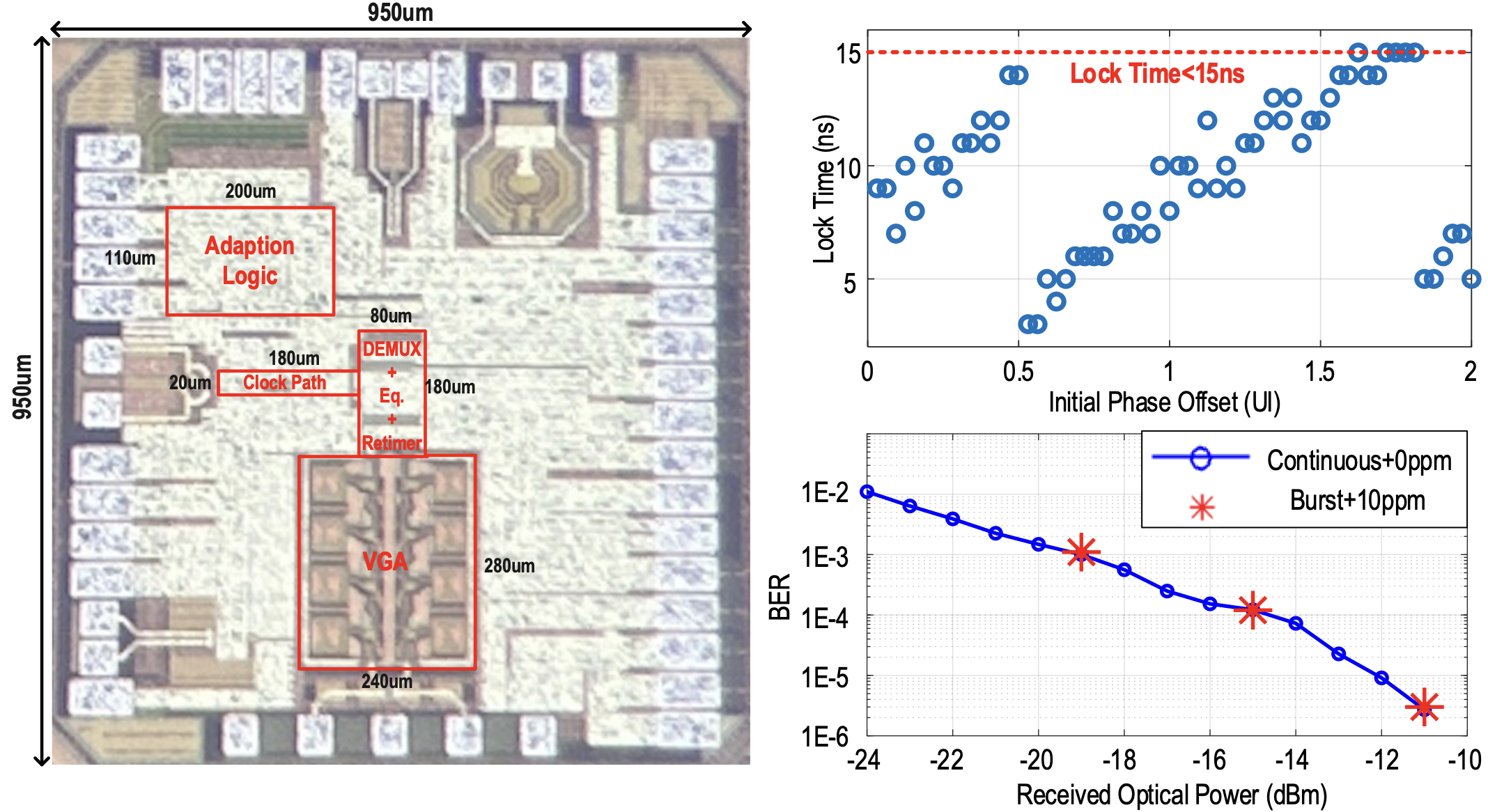 该工作以“A 50Gb/s Burst-Mode NRZ Receiver with 5-Tap FFE, 7-Tap DFE and 15ns Lock Time in 28nm CMOS for Symmetric 50G-PON”为题发表,共同第一作者为博士生张泊洋、叶天辰,通讯作者为盖伟新。