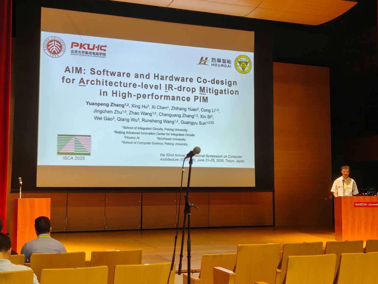 随着存算一体(Processing-In-Memory, PIM)芯片性能的持续攀升,供电电压降(IR-drop)问题日益成为制约其性能、能效与可靠性的关键瓶颈,而传统电路级优化方法往往需在功耗、性能或面积上做出妥协,难以实现系统化解决。针对这一挑战,研究团队创新性地提出了AIM软硬件协同设计。AIM首创性地建立了量化工作负载与IR-drop关联的关键参数HR,开发了基于正则化与权重优化的算法以降低权重HR值,设计了动态反馈系统实现电压/频率的实时调节以应对IR-drop波动,并通过HR感知的任务映射机制实现了跨层协同优化。这一系列软硬件协同创新技术有效缓解了高性能PIM芯片的IR-drop问题,同时显著提升了芯片性能与能效表现。基于一款256 TOPS PIM芯片的后仿真验证数据表明,AIM能够将IR-drop大幅降低69.2%,并同步实现能效提升2.29倍或性能增益15.2%。该工作以《AIM: Software and Hardware Co-design for Architecture-level IR-drop Mitigation in High-performance PIM》为题发表(博士生张远鹏为第一作者、孙广宇副教授为通讯作者)。