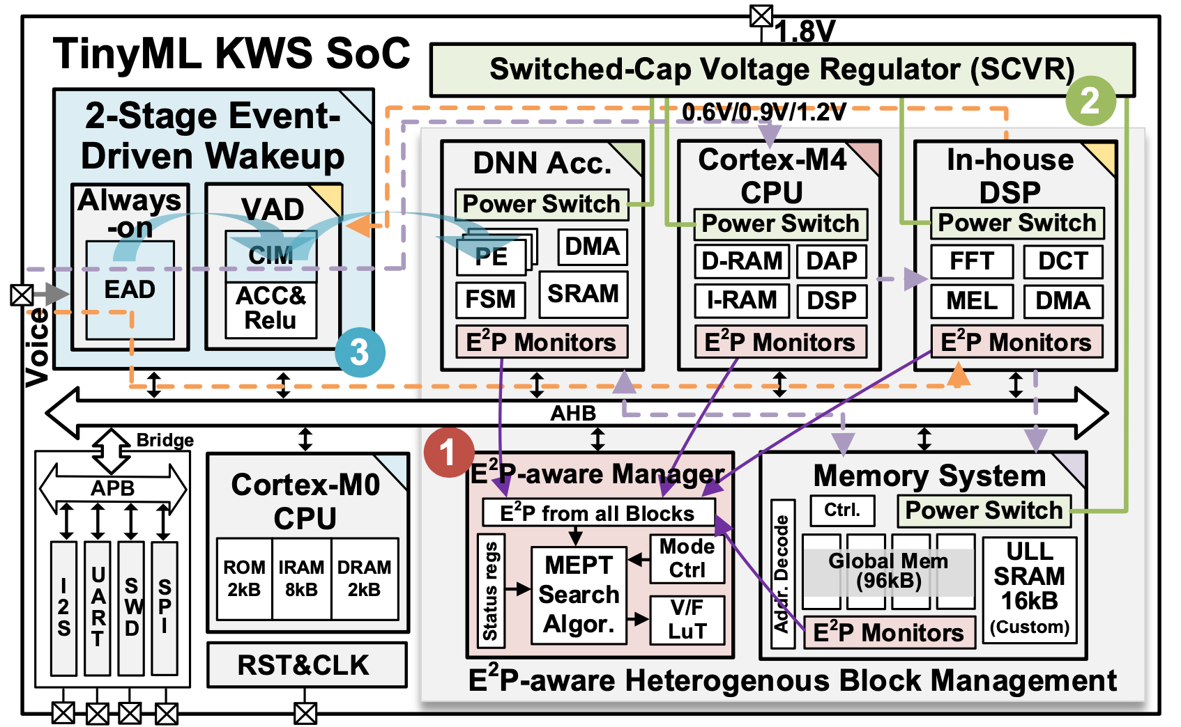 针对以上问题,黄如院士-叶乐教授、贾天宇研究员团队等提出了一种具有端到端能耗-事件-性能感知的系统级电源管理的异构TinyML SoC,实现了最低3.5µW和30000倍的峰值到空闲功耗比。这种端到端性能感知管理利用各种完全可综合的监视器来了解异构块的运行状态,并使用层次化的电压调节进行系统级的最小能量点搜索,相比于单一块的最小能量点,能节省超过28%的能耗。团队还开发了一种基于存内计算的两阶事件驱动唤醒方案,以减少超过87%的常开能耗。