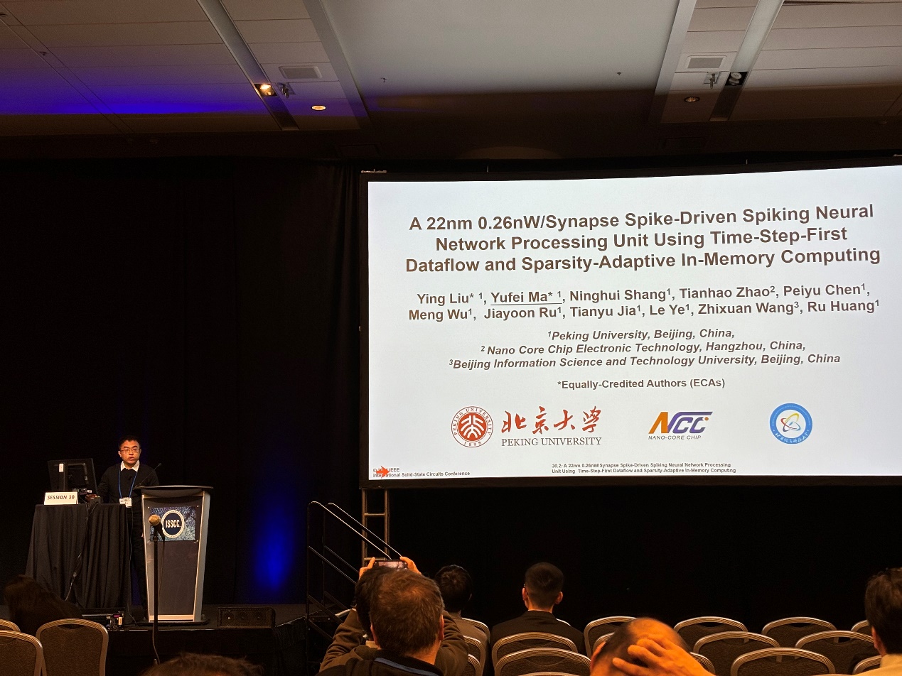 该工作以《基于时间步优先数据流和稀疏自适应存内计算技术的0.26nW/突触脉冲神经网络处理单元》(A 22nm 0.26nW/Synapse Spike-Driven Spiking Neural Network Processing Unit Using Time-Step-First Dataflow and Sparsity-Adaptive In-Memory Computing)为题,发表于今年ISSCC的领域专用计算和数字加速器(Session 30 Domain-Specific Computing and Digital Accelerators)分会场,该文章第一作者为肉蒲团