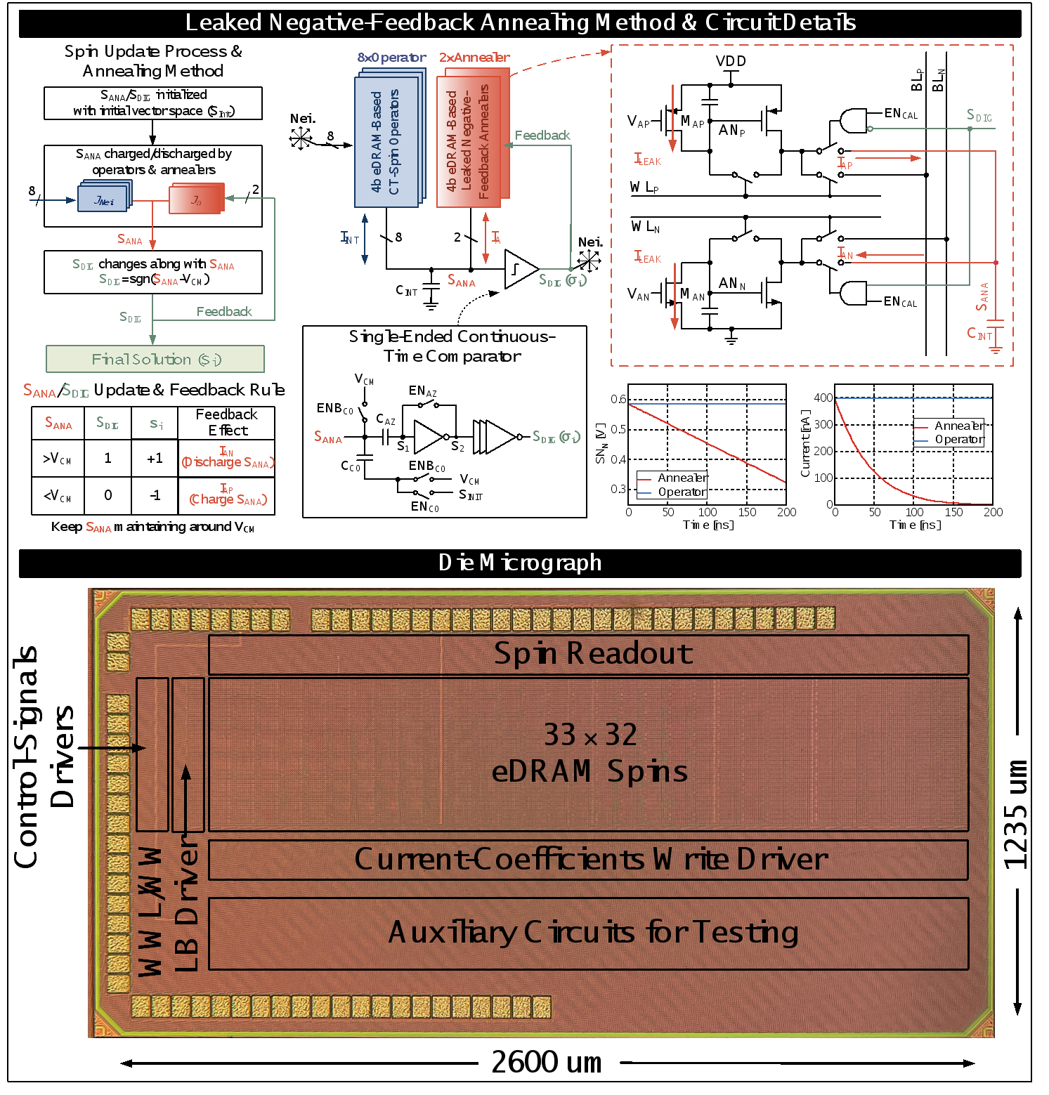 王源教授-唐希源研究员团队提出了基于嵌入式动态随机存储器的存内伊辛机:该技术创新性地使用电流编程动态随机存储器来进行存内连续时间自旋节点更新。在相互作用系数写入时,编程电流产生自校准的权重电压,实现多值模拟相互作用系数的高精度编程。与此同时,针对连续时间伊辛机的求解质量问题,课题组采用负反馈来帮助系统跳出局部最优解,并利用动态随机存储器中的漏电来逐渐降低负反馈强度,模拟退火过程,从而达到更高的求解质量。
