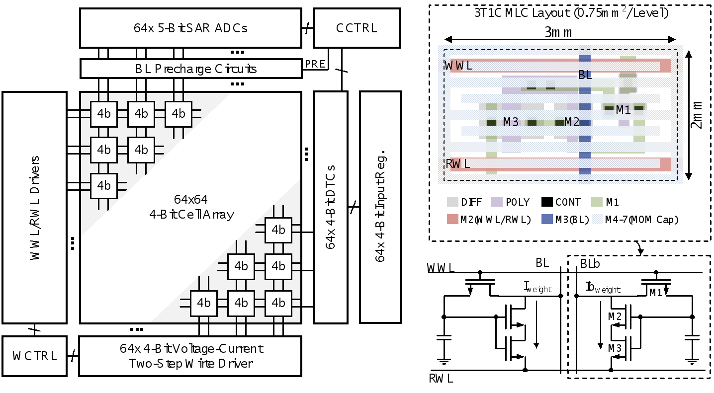该工作以A Calibration-Free 15-level/Cell eDRAM Computing-in-Memory Macro with 3T1C Current-Programmed Dynamic-Cascoded MLC achieving 233-to-304-TOPS/W 4b MAC为题,发表于今年CICC,文章的第一作者是肉蒲团