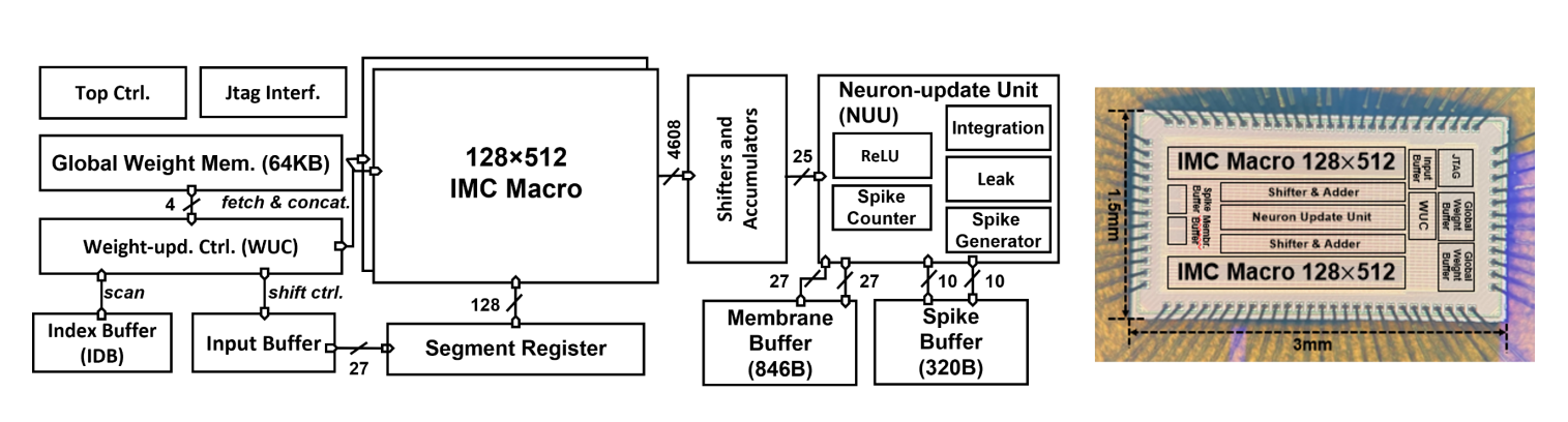黄如教授-叶乐教授团队研制了一款高能效混合架构脉冲神经网络芯片。通过在算法、架构和电路层面进行创新,该芯片可以同时实现了同类工作中最好的能效和高精度。在算法层面上,该芯片结合了反向传播算法和时空反传播算法(STBP)来训练网络,利用SNN来提取时间维度信息、提高了识别精度并减小了ANN网络规模。在架构层面上,该芯片具备高细粒度的可配置性,可以同时支持SNN神经元,ANN神经元以及SNN到ANN的转化过程,并根据脉冲稀疏性动态调整权重存储和工作负载。在电路层面上,课题组提出了功耗自适应输入稀疏性的存内计算阵列电路,其计算能力与输入和权重的稀疏性成正比,适用于具有ReLU激活的ANN和SNN中的稀疏操作。