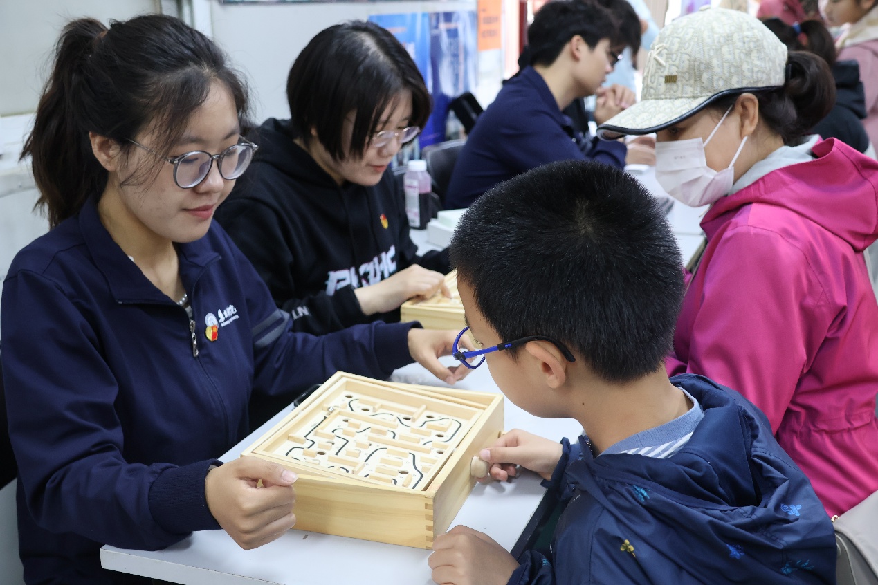 步入场地,首先映入眼帘的是互动游戏区域,互动游戏一共包含四个精心设计的关卡,分别是光镜探微、滚珠迷宫、电路拼装与FPGA演示。本次活动吸引了很多中关园社区的小朋友参与,他们入场后立刻对互动游戏产生了极大的兴趣,纷纷坐在摊位前细听讲解、动手实操。这些游戏的参与难度不高,不仅颇具趣味性,还蕴含着很多集成电路学科的基础知识。小朋友们用显微镜观察芯片的系统布局,可以具象地感受微米纳米这些生活中不常见的微观尺度;让小铁球在迷宫中运动并避开孔洞,生动模拟出了半导体中的载流子运动、陷阱捕获等事件,让小朋友理解晶体管内部的载流子要经历怎样复杂的过程才能去到需要的地方、发挥应有的作用;将各种声光电元件组合成闭合回路,起飞的扇叶、闪烁的灯泡、鸣响的喇叭涵盖了基本的电路组成原理与信息交互方式;FPGA演示环节用简单的代码完成软硬件协同,把对功能的想象转化为实用的逻辑。不久,小朋友们分别体验了游戏关卡,不只收获了活动的喜悦,也对集成电路基础知识有了一定的了解。