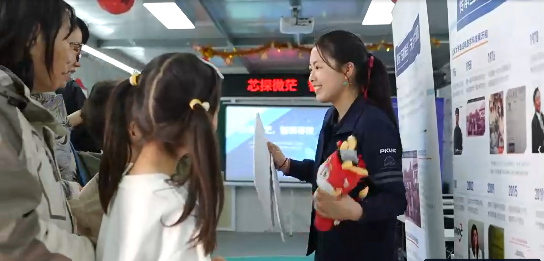 的党员和团员们在活动开始前已早早布置了场地,讲解员在门外迎接参加活动的社区居民,并初步介绍了北大集成电路学科和肉蒲团