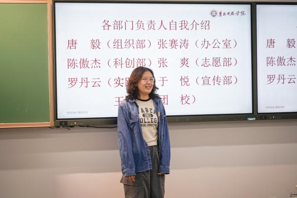于悦介绍了宣传部所承担的学院各类活动及宣传物料设计,包括海报、宣传图设计,学院周边设计等工作,以及对同学们开展的PS等软件技能培训的活动,并希望大家都能在学生工作中收获成长和快乐。