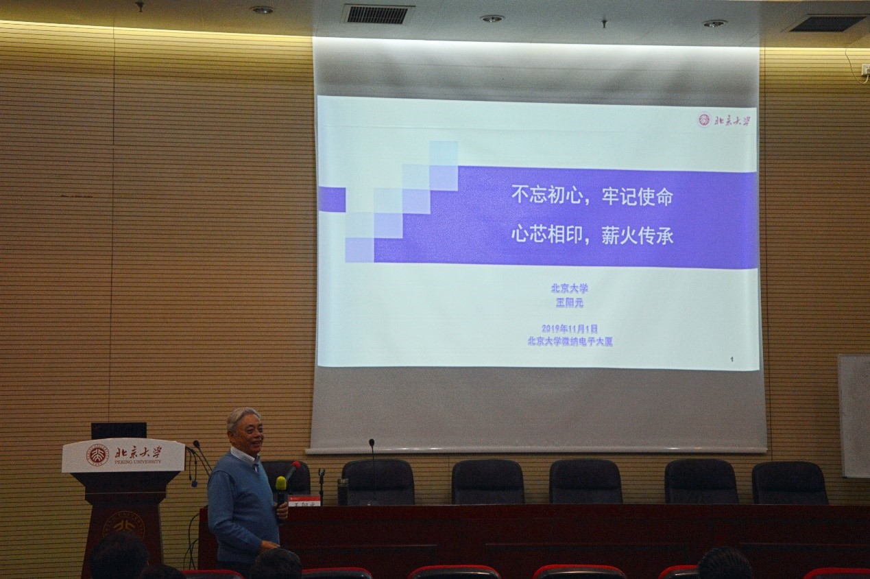 2019年月11日1日上午,信息科学技术学院微纳电子直属党支部及微电子ULSI、SOC、MEMS三个学生支部、软件与微电子学院教师党支部,共同在微纳电子大厦103报告厅进行了“不忘初心,牢记使命”主题教育活动,活动特别邀请了中国科学院院士、首席科学家王阳元老师给同志们讲党课。教职工和学生党员、新生入党积极分子共82人参加了本次活动。会议由信息科学技术学院党委副书记、微纳电子直属党支部书记王源主持。