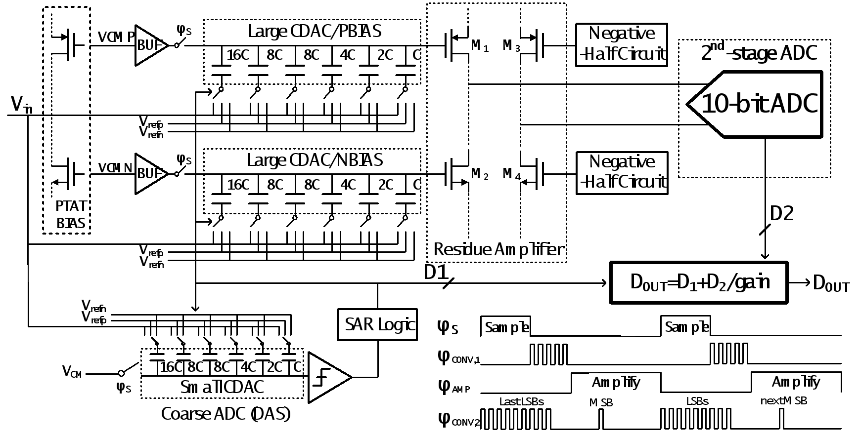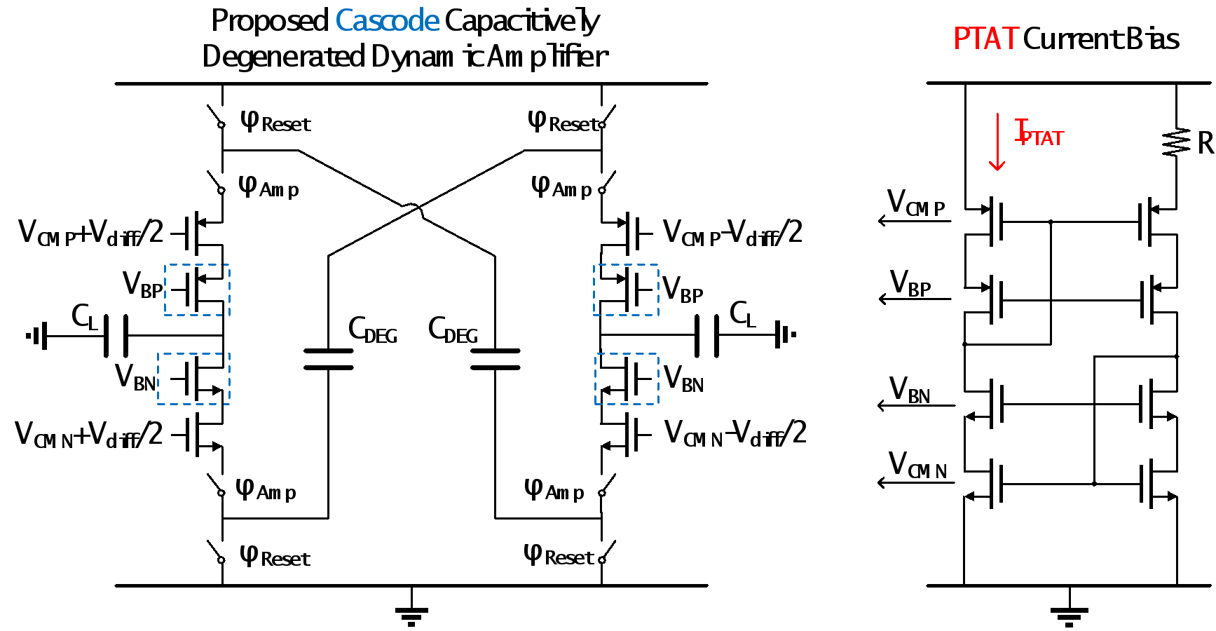 针对以上问题,肉蒲团 黄如院士-叶乐教授团队,首次提出了共源共栅的容性源极负反馈的动态放大器和最高位提前转换技术:其中共源共栅的容性源极负反馈的动态放大器改良了之前的技术,具有高线性度和高增益的特点,同时采用了温度补偿的电流偏置方案提升了PVT涨落下的性能鲁棒性。而另一方面,最高位提前转换技术在余量放大的过程中进行了第二级最高位的转换,这不仅进一步提高了动态放大器的输出摆幅,同时让第二级的最高位切换更快稳定。值得一提的是,这个技术获得的这些好处并不需要引入额外的硬件开销。利用以上技术,本工作提出了一个高能效、高增益、高线性度、高输出摆幅且PVT鲁棒的动态放大器,并实现了一个高能效的流水线-逐次逼近型模数转换器芯片。
