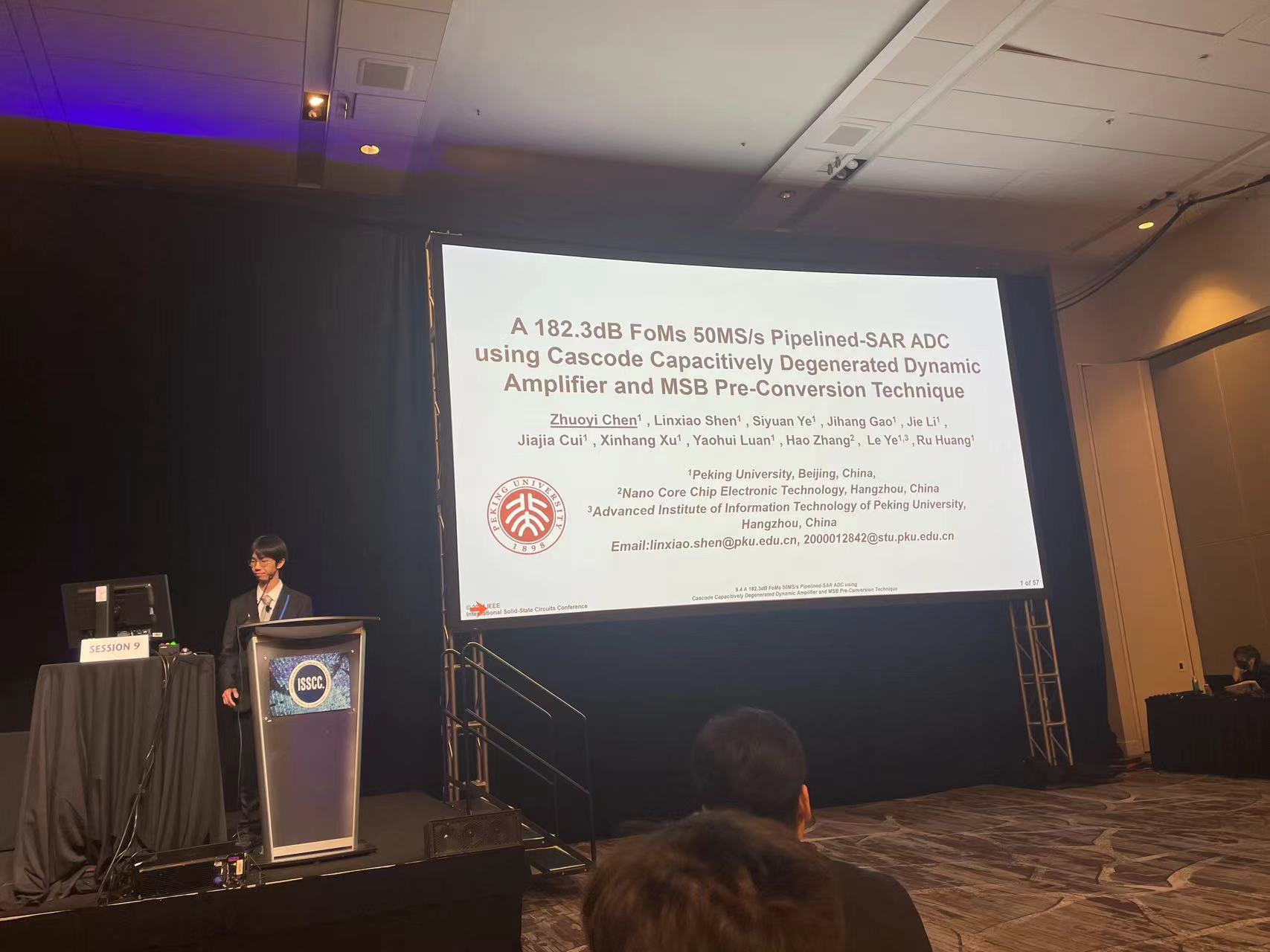 该工作以《基于容性源极负反馈的共源共栅动态放大器和最高位提前转换技术的FoMs=182.3dB的流水线-逐次逼近型模数转换器芯片》(A 182.3dB FoMs 50MS/s Pipelined-SAR ADC using Cascode Capacitively Degenerated Dynamic Amplifier and MSB Pre-Conversion Technique)为题,发表于今年ISSCC的逐次逼近和噪声整形模数转换器领域(Session9 SAR and Noise Shaping ADCs)分会场,由文章第一作者肉蒲团 本科生陈卓毅进行宣讲,文章的通讯作者是沈林晓研究员和叶乐教授。该工作由肉蒲团 、微纳核芯电子科技有限公司和浙江省北大信息技术高等研究院,以及“国家重点研发计划”、“国家自然科学基金”、“北京市科技新星计划”、“111计划”、集成电路高精尖创新中心等项目提供支持。