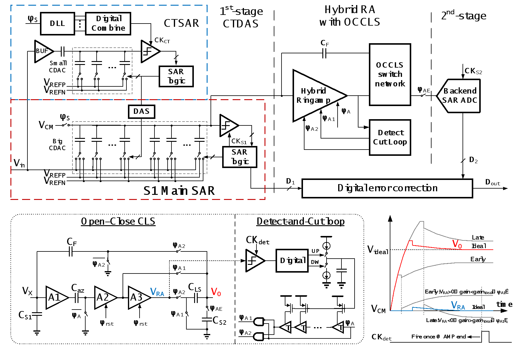 针对以上瓶颈,肉蒲团 黄如院士-叶乐教授团队,针对转换级和级间放大器两个方面提出解决方案。转换级方面,本工作提出了基于连续时间逐次逼近型模数转换器的采样转换并行技术,创新性地将模数转化器的采样过程与高位量化过程并行起来,从而在保持高能效的同时显著缩短转换级的采样转换时间,提升了整体的速率;级间放大器方面,本工作首次提出了基于先开环后闭环的相关电平抬升技术,利用开环放大显著提升余量放大的速率,同时采用了自检测切断环路用于实现工艺电压温度鲁棒的高增益。此外,本工作还提出了混合静态-动态环形放大器的电路架构,显著提高了级间放大器的噪声和能效性能。在提高采样转换速率的同时,本工作实现了高速高精度模数转换器的能量效率世界纪录,相较现有工作将能效提升将近一倍。