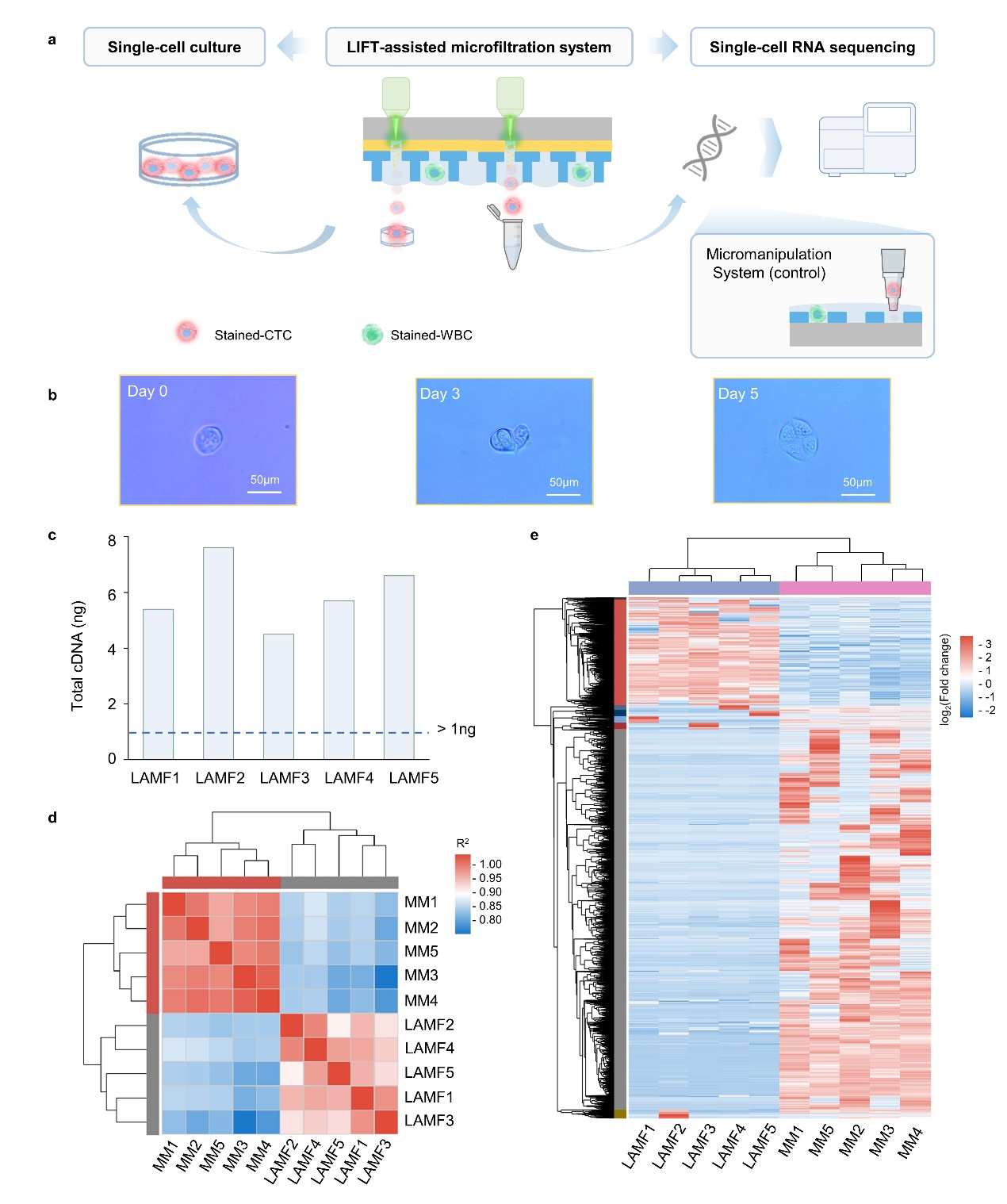 该系统的核心为与LIFT兼容的双阶微孔滤膜器件,由上下两层微孔结构组成。下层微孔用于基于物理尺寸的细胞富集,而上层较大微孔用于封装捕获的单细胞液滴。通过优化器件的结构设计,LIFT-AMFS在CTC富集阶段的细胞俘获效率高达88%,最高处理通量达到15.0 mL/min,在单细胞分选阶段的得率超过95%。此外,该系统在保持目标细胞活性的同时,实现了单细胞水平的高精度分选,回收的CTC可直接用于单细胞体外培养及单细胞转录组测序。实验结果表明,回收细胞的cDNA产量可满足测序文库构建需求,所有单细胞测序数据的Q30评分均超过95.92%。与现有单细胞分选技术相比,LIFT-AMFS在无标记富集、细胞活性保持及单细胞分选精度等方面展现出显著优势,为肿瘤生物学研究提供了强有力的工具。