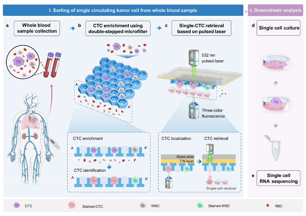 循环肿瘤细胞(CTC)是一类稀有且具有高度异质性的癌细胞群体,被广泛认为是癌症转移监测及个性化医疗发展的关键生物标志物。传统的CTC分析方法(如计数和染色技术)在评估癌症转移潜力及临床意义方面发挥了重要作用。然而,这些方法主要停留在细胞水平,难以实现分子层面的深入解析,限制了对CTC生物学特性的全面理解。为突破这一局限,近年来单细胞分选技术迅速发展,包括荧光激活细胞分选、磁激活细胞分选及基于微孔或微滴的方法。然而,这些技术在处理极低丰度的CTC或少量细胞样本时存在局限性,实现从全血中高效富集并分选高活性CTC仍是一项重大挑战。