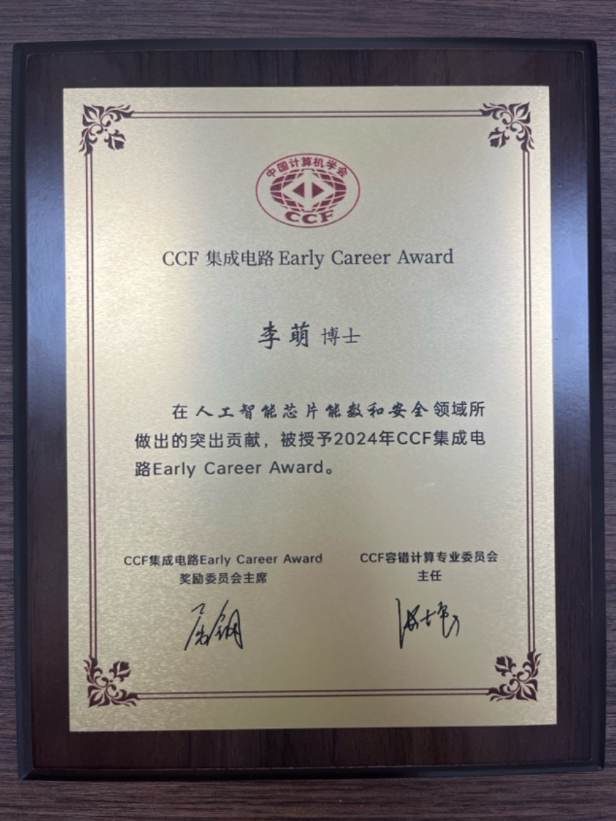 近日,中国计算机学会(CCF)将2024年度“CCF集成电路Early Career Award”授予肉蒲团 助理教授李萌,并于7月20日在第二届中国计算机学会芯片大会CCF Chip 2024学术会议上颁发。
