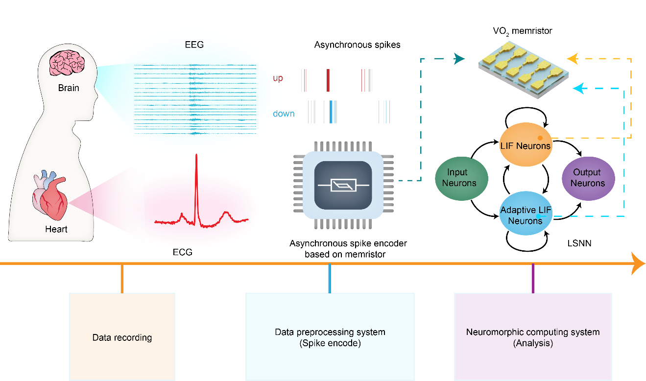 生理信号蕴含着大量与情绪、认知、健康等方面相关的宝贵信息,因此对生理信号的有效提取、处理和分析极具意义,其在下一代人机交互系统中起着非常关键的作用。与传统的冯·诺伊曼计算架构相比,利用神经形态计算架构实现生理信号检测系统更具速度和能效优势。这种新型计算范式受生物神经系统启发,利用脉冲来表达和处理信息,因此需要将生理信息编码成脉冲信号。异步脉冲编码所得到的脉冲序列包含具体的时刻信息,更优于传统的频率编码,但目前基于CMOS的实现方式需要高硬件开销的数模转换器和复杂的控制电路。此外,自适应神经元广泛存在于生物神经系统中,并在时序信息的处理中扮演着重要角色,但目前基于CMOS或忆阻器实现自适应神经元的方案同样面临电路复杂和开销大的问题。
