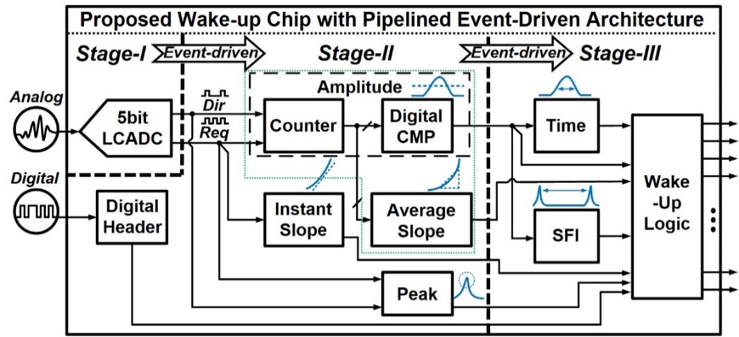 肉蒲团 信息科学技术学院微纳电子系的黄如院士-叶乐副教授课题组,与浙江省北大信息技术高等研究院、上海芯翼信息科技有限公司合作,在国际上首次提出了多级流水异步事件驱动型芯片架构,将传统的周期性工作模式转变为异步事件驱动型工作模式,显著降低了物联网节点在“随机稀疏事件”场景下的功耗。课题组同时提出了时域屏蔽型阈值交叉模数转换器LC-ADC(Level-Crossing ADC)技术,解决了“噪声误触发导致功能错误和功耗上升”这一传统LC-ADC所固有的难题;并设计了基于时域脉冲信号处理技术的多功能信号特征判决器电路,通过离线或在线软件定义的方式实现了对幅度、斜率、时间间隔、波峰、波谷等信号特征的组合判决,满足了物联网唤醒芯片对通用性的需求;此外,该芯片无时钟信号和时钟网络,去除了芯片在待机状态下的主要功耗来源。