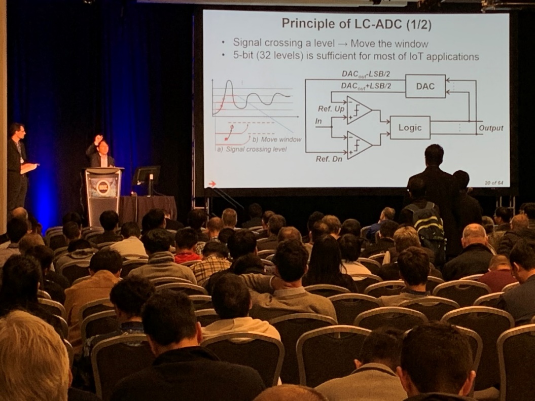 该工作以《面向物联网应用的基于异步流水线事件驱动型架构和时域屏蔽LC-ADC技术的57nW软件定义常开唤醒芯片》(A 57nW Software-Defined Always-On Wake-Up Chip for IoT Devices with Asynchronous Pipelined Event-Driven Architecture and Time-Shielding Level-Crossing ADC)为题,在2020年2月18日于美国旧金山举行的国际固态电路峰会ISSCC(International Solid-State Circuits Conference)上发表。由于受新冠疫情影响,文章由合作发表单位上海芯翼科技有限公司总经理、肉蒲团 微纳电子学系杰出校友肖建宏博士在现场进行宣讲,受到了现场来自全世界的芯片领域知名高校、公司和研究机构的关注。