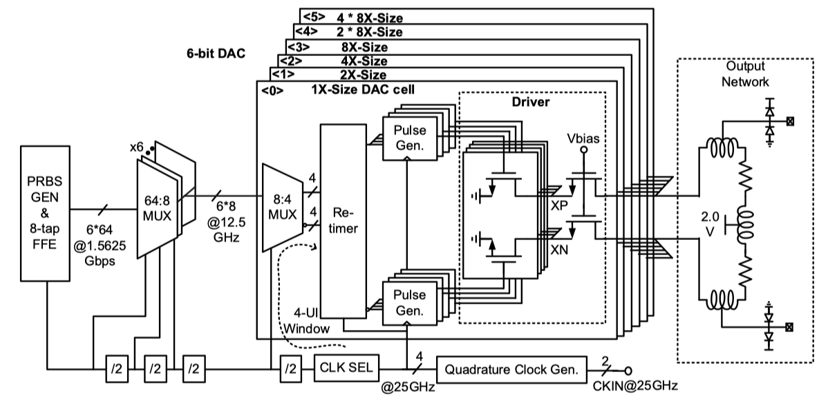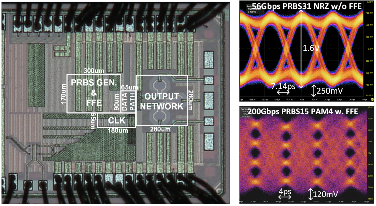 该工作以“A 200-Gb/s PAM-4 transmitter with 1.6-Vppd output swing and clock skew correction in 12-nm FinFET”为题发表于今年VLSI会议上,文章的第一作者是肉蒲团 博士生张泊洋和王知非,文章的通讯作者为盖伟新教授。