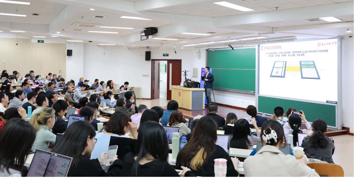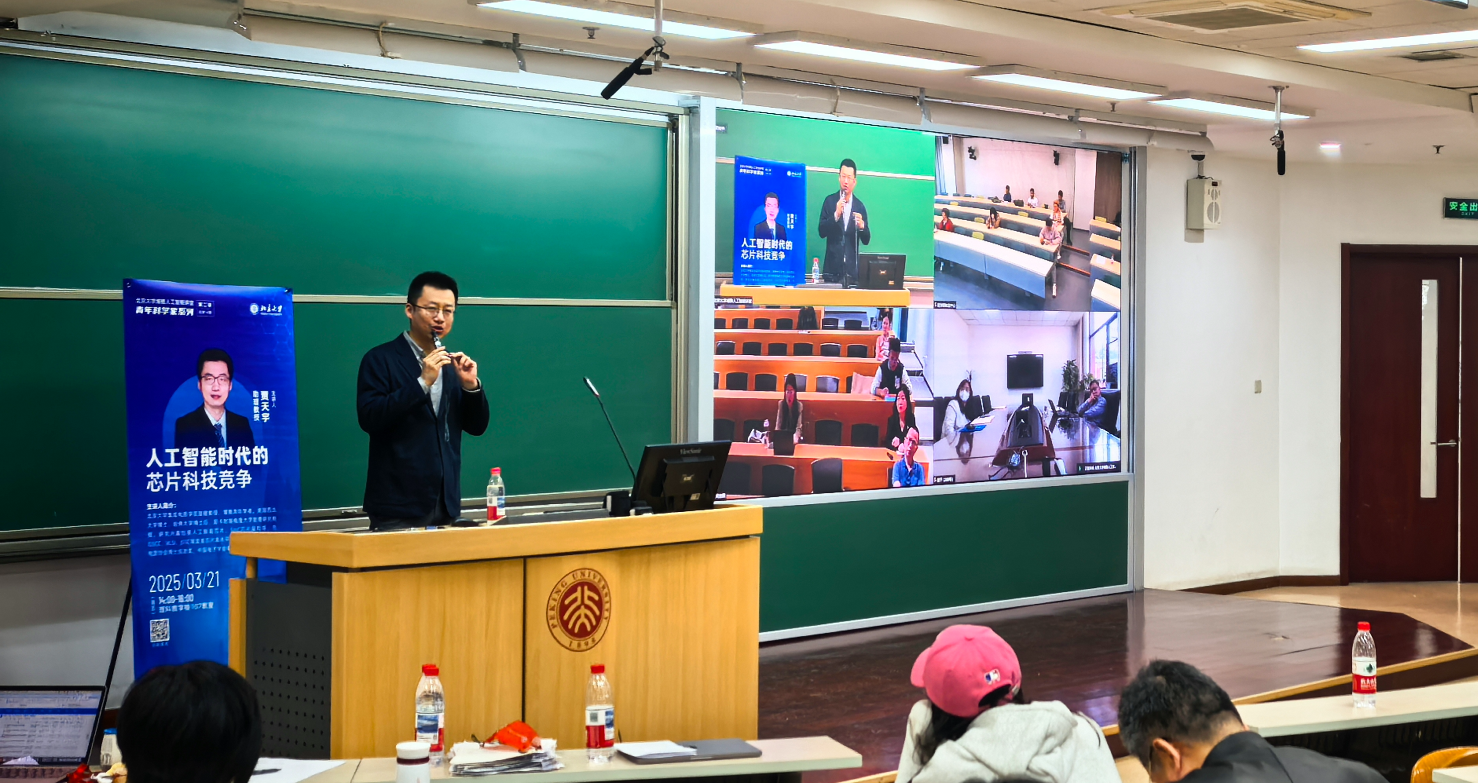 助理教授、博雅青年学者贾天宇以“人工智能时代的芯片科技竞争”为题作报告。本次讲座设立燕园校区主会场及新燕园校区、医学部和深圳研究生院三个分会场,全校400余名师生通过线上线下相结合的方式联合学习,共同探索人工智能时代芯片科技竞争的前沿领域。