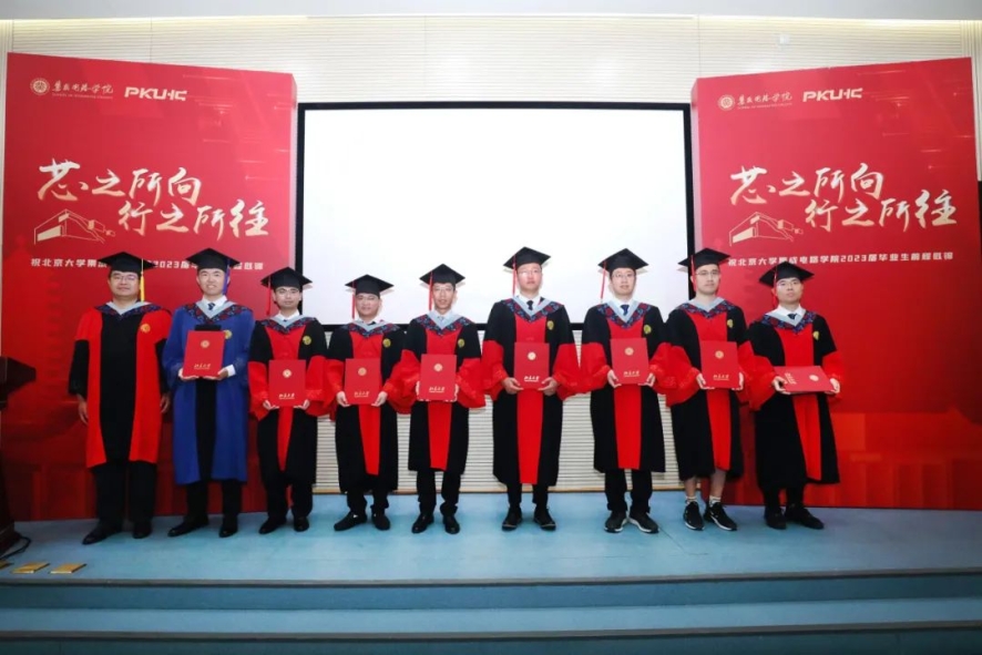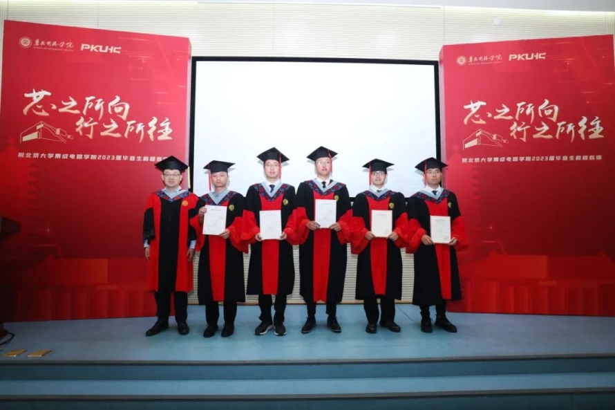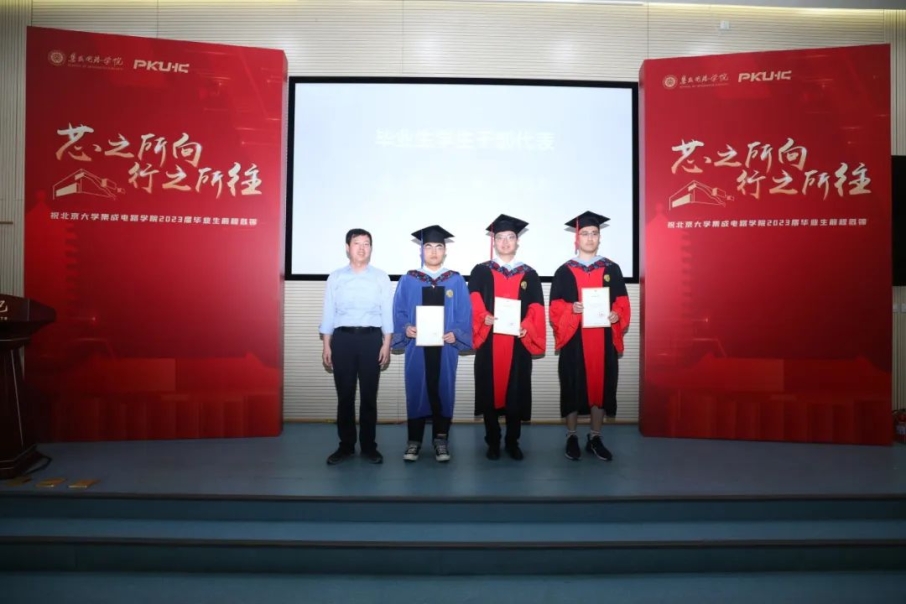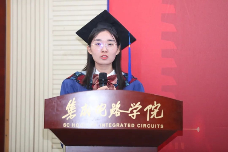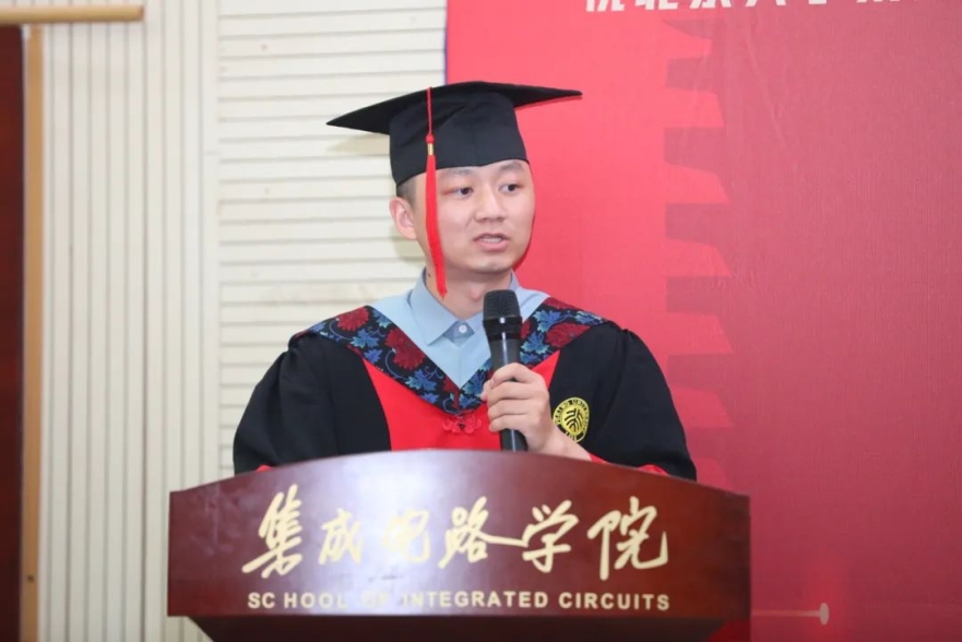 硕士毕业生代表张霜杰对学院的培养表示感谢,并分享了自己曾作为毕业典礼志愿者的经历,而如今,自己也将身着学位服奔赴下一站。她表示,北大“芯”青年们将与境遇奋斗,与时代奋斗,与经验奋斗,勇挑时代担当,助力国家民族复兴大业。