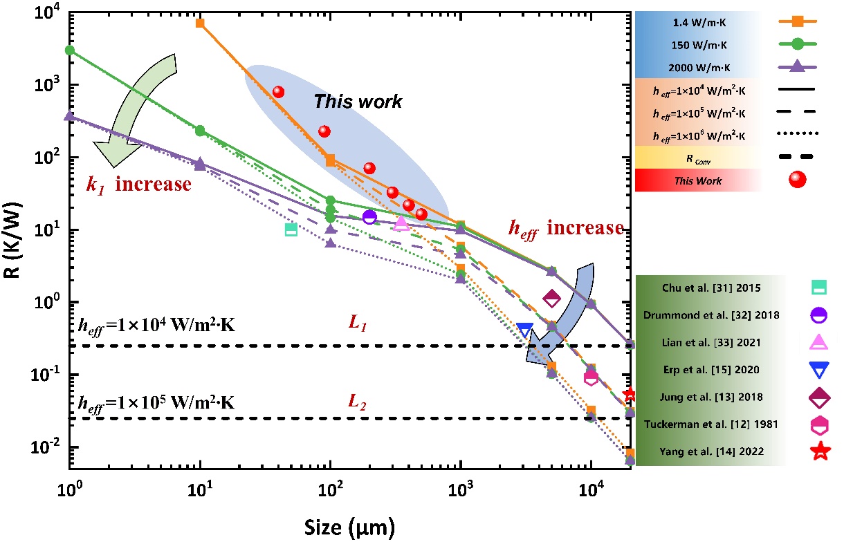 该研究进一步深入探索了不同尺寸热源热管理的关键手段,当热源为点热源形式时(如高电子迁移率晶体管(HEMT)),主要热阻为扩散热阻,此时在热源近结区集成高导热材料是降低热阻的重要方式。在特定热点尺寸下,近结集成诸如单晶金刚石等高导热材料,较于氧化硅等低导热材料,总热阻可以降低两个数量级。当热源为面热源形式时(如高性能AI计算芯片),主要热阻为热汇热阻,此时增强器件基底的对流换热能力是提升该类器件散热性能的重要方式,如通过优化微通道结构,增强热汇换热能力可以有效降低此类器件的热阻。该工作通过实验和理论计算解析了典型电子器件中的热阻构成并提出了相应的解决办法,为下一代具有复杂发热模式的芯片与集成芯片系统的热设计带来新的理解和思路。