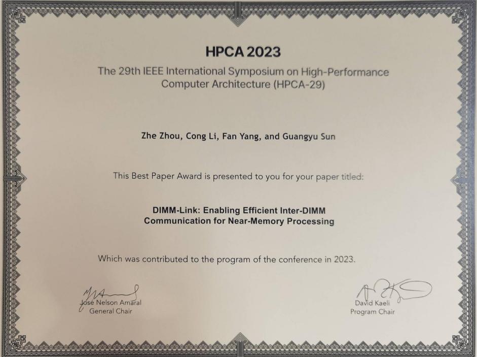 HPCA最佳论文获奖证书