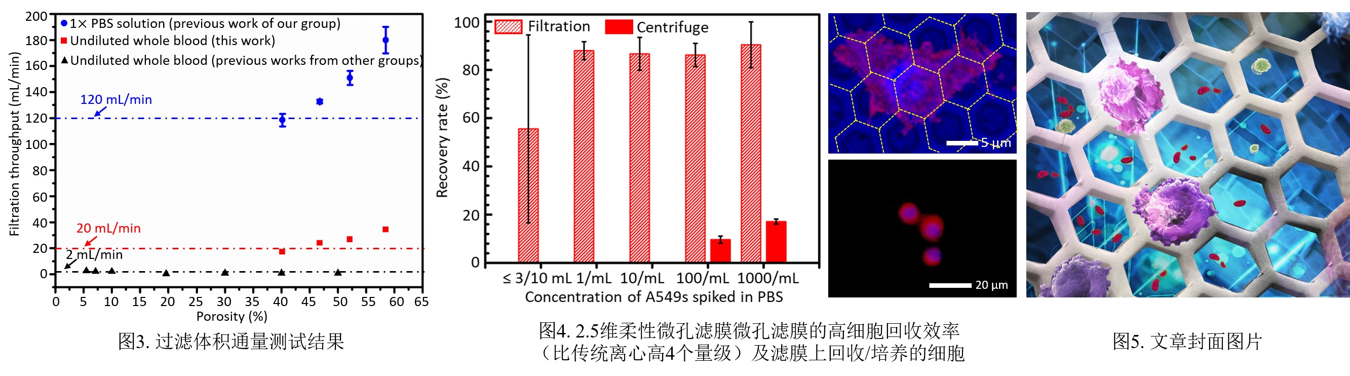 目前课题组正与多家医院的呼吸内科、皮肤科、泌尿外科、重症监护科、检验科等多个科室合作,开展所开发的2.5维柔性微孔滤膜技术在多种肿瘤诊断、预后监测以及真菌血症等临床重症诊断中的应用。该2.5维柔性微孔滤膜还被美国麻省理工学院、波士顿大学、圣母大学、加州大学戴维斯分校,以及清华大学、上海交通大学、复旦大学、中国科学院青岛生物能源与过程研究所和苏州创澜生物科技有限公司等多家知名大学研究团队与公司应用于多种细胞/微生物分离的研究和应用中,受到广泛好评,展现出优异的应用潜力。