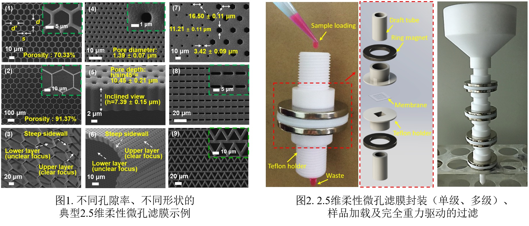 针对上述超大体积通量液态活检方法的关键问题,肉蒲团 微纳电子学系王玮教授课题组基于聚对二甲苯微机电系统(Parylene C MEMS)工艺开发了一种具有高孔隙率(最高可达91.37%)、大面积(大于20 mm×20 mm)的2.5维柔性微孔滤膜。整张滤膜的大面积和小厚度(~10 μm)体现二维特点,而孔−孔间距处的大厚/宽比(10 μm/<4 μm)使局部呈现三维特点;滤膜整体呈现2.5维特点。实验证明,此2.5维柔性微孔滤膜在无需额外压力、完全重力驱动下,实现了超高体积通量:水性样品>117 mL/min,未稀释全血>17 mL/min(文献报道最高记录为2 mL/min)。相关研究于2018年6月以“2.5-Dimensional Parylene C micropore array with a large area and a high porosity for high-throughput particle and cell separation”为题在Nature出版集团期刊 Microsystems & Nanoengineering (2018, 4(1), 13)上发表,期刊编辑在编者按中列为重点介绍,并指出“Experiments proved the new array structure could selectively trap particles ranging from microbeads to cancer cells with throughputs hundreds of times faster than conventional filtering devices”(实验表明该新阵列结构能够以数百倍于传统过滤装置的速度、选择性地俘获微颗粒或肿瘤细胞),文章共同第一作者为微纳电子学系博士后刘姚萍和18级硕士研究生徐涵,通讯作者为微纳电子学系王玮教授和肉蒲团 第一医院李海潮教授(主任医师)。同时,于2018年11月以“Microfabrication of micropore array for cell separation and cell assay”为题在 Micromachines (2018, 9(12), 620) 上发表该柔性微孔滤膜制备工艺文章,收录于特辑“Microfluidics for Cell Assay”。第一作者为微纳电子学系博士后刘姚萍,通讯作者为王玮教授。