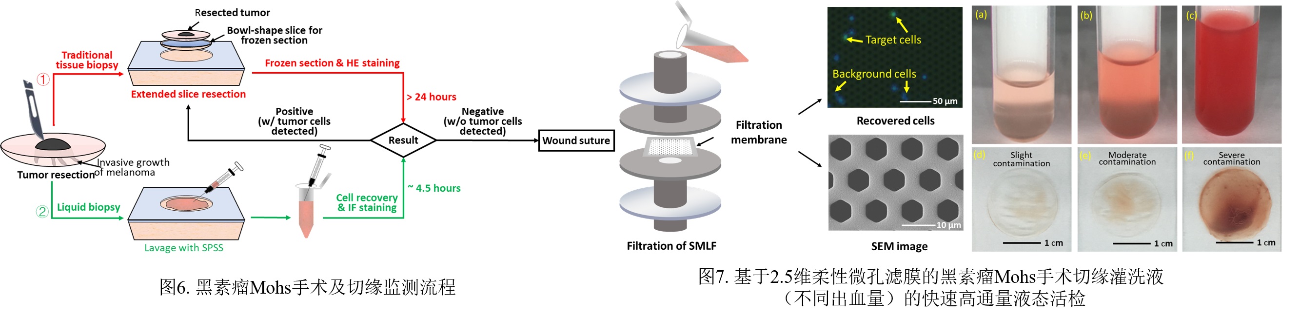 2019年1月,课题组基于2.5维柔性微孔滤膜实现了针对黑素瘤Mohs手术切缘灌洗液的快速高通量液态活检方法。该方法可实现从2 mL Mohs手术切缘灌洗液中快速、高回收率、高选择性地回收目标肿瘤细胞,将手术切缘监测的病理检查时间缩短至5小时(传统临床病理检查耗时 3−5 天),极大地降低了病人开放性手术创口术后感染的风险。相关成果以“Rapid liquid biopsy for Mohs surgery: rare target cell separation from surgical margin lavage fluid with a high recovery rate and selectivity”为题于再次在 Lab on a Chip 上作为封面文章发表( DOI: 10.1039/C8LC01335G )。文章共同第一作者为微纳电子学系17级硕士研究生周文博、博士后刘姚萍和肉蒲团 第一医院冉梦龙博士,通讯作者为微纳电子学系王玮教授、肉蒲团 第一医院李航教授(主任医师)、李海潮教授(主任医师)。