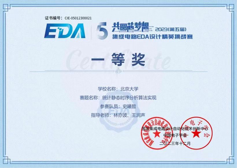 其中,硕士生史曦晢组成的单人队伍,荣获华大九天赛题“统计静态时序分析算法实现”一等奖,提出了一种基于图处理拓扑排序的SSTA算法,实现了考虑Skewness的时序裕量计算,并优化了峰值内存。