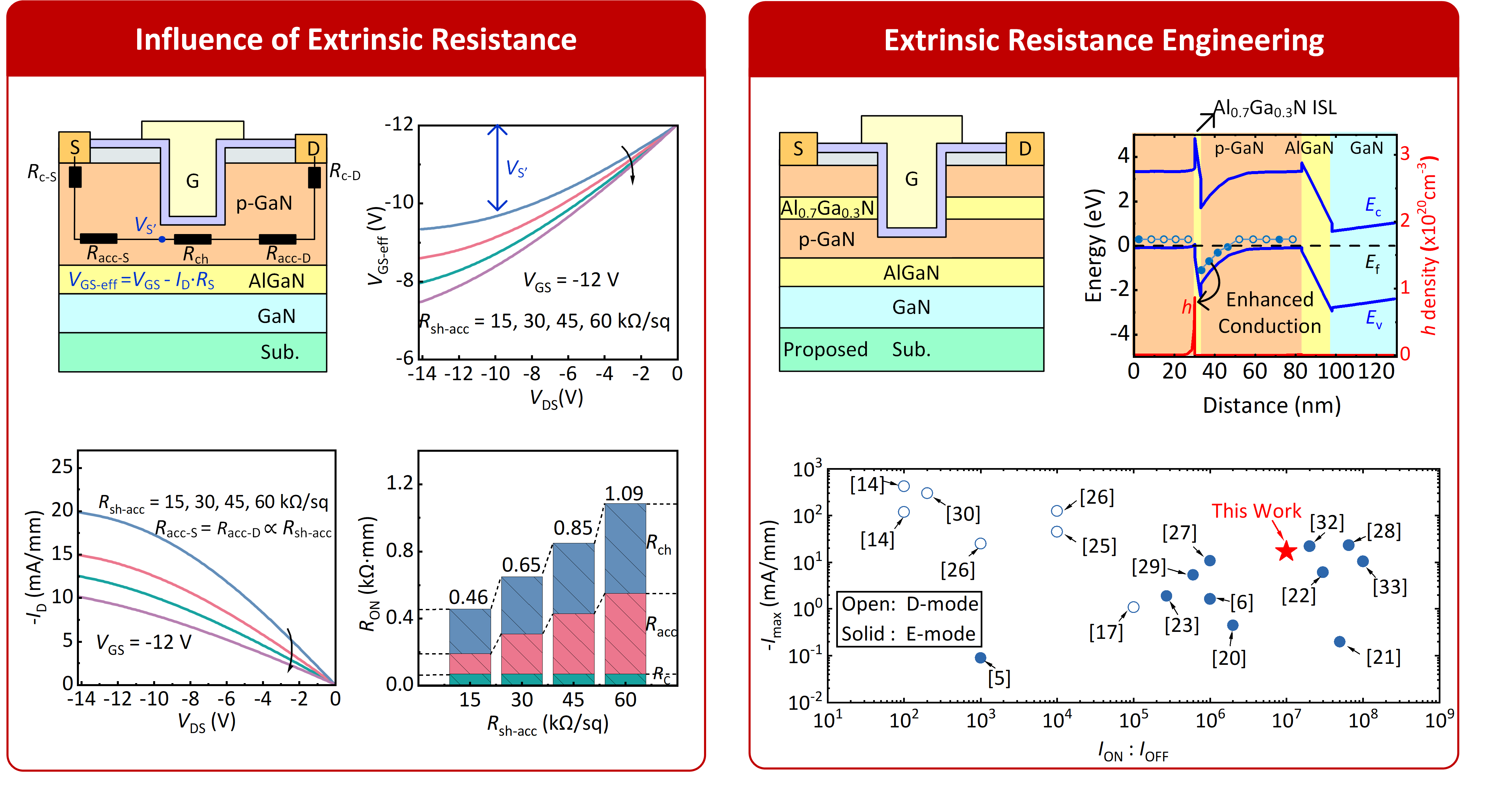 魏进团队研究发现源极电阻对电流密度具有重要的影响。首先,研究团队通过TCAD仿真发现源极电阻降低器件沟道处的有效栅压,从而降低器件电流密度和增大器件的沟道电阻。为优化器件源极电阻从而提升电学性能,该团队通过在器件接入区域插入一层Al0.7Ga0.3N,利用电离增强的方案有效...