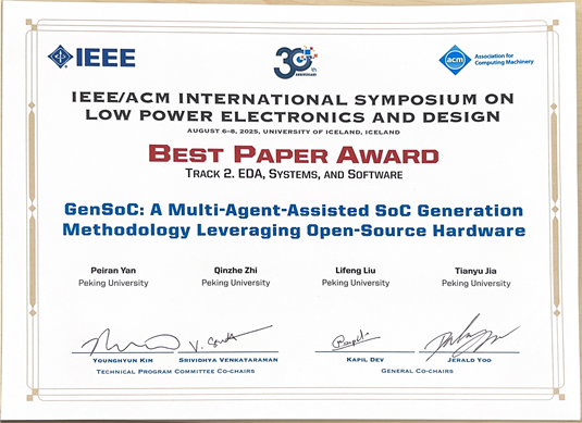贾天宇研究员团队的论文“GenSoC: A Multi-Agent-Assisted Soc Generation Methodology Leveraging Open-Source Hardware”荣获会议EDA track“最佳论文奖”。