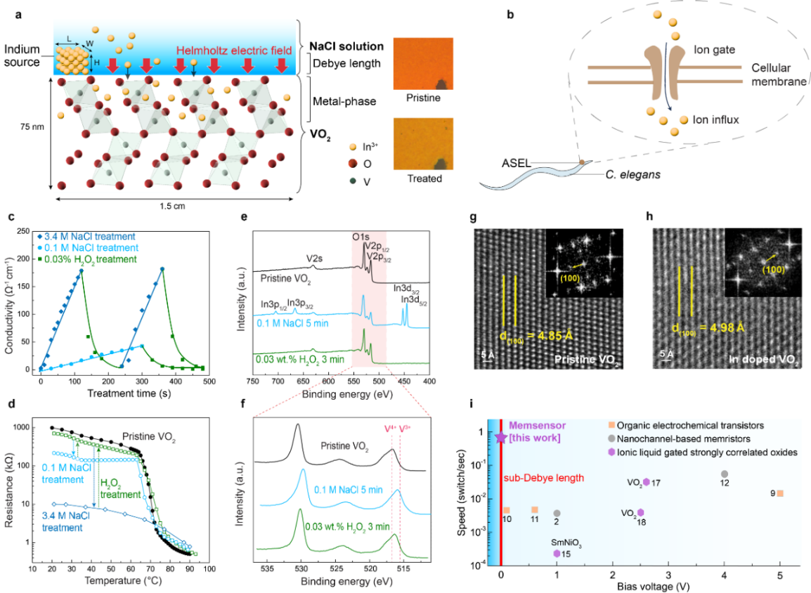 在神经元中,离子(如 Na⁺、Ca²⁺)的流动构成了大脑处理信息的“信号语言”——它们穿越细胞膜,引发神经元的兴奋与响应,实现感知和记忆。正因如此,模拟这种“离子驱动”的感知与记忆行为,已成为类脑电子器件研究的重要方向。尤其是在水下、盐水或体液等典型“湿环境”中,开发能同时具备感知功能和信息留存能力的器件,对于类脑计算、智能机器人、生物接口、环境监测等领域具有重大意义。然而,水中丰富的可移动离子也带来了根本性的挑战:它们会在纳米尺度上迅速屏蔽电场,形成所谓的 Debye 屏蔽效应。这不仅限制了离子的响应速度,也使得传统器件在液体环境中往往依赖外加电压,限制了器件设计的灵活性。