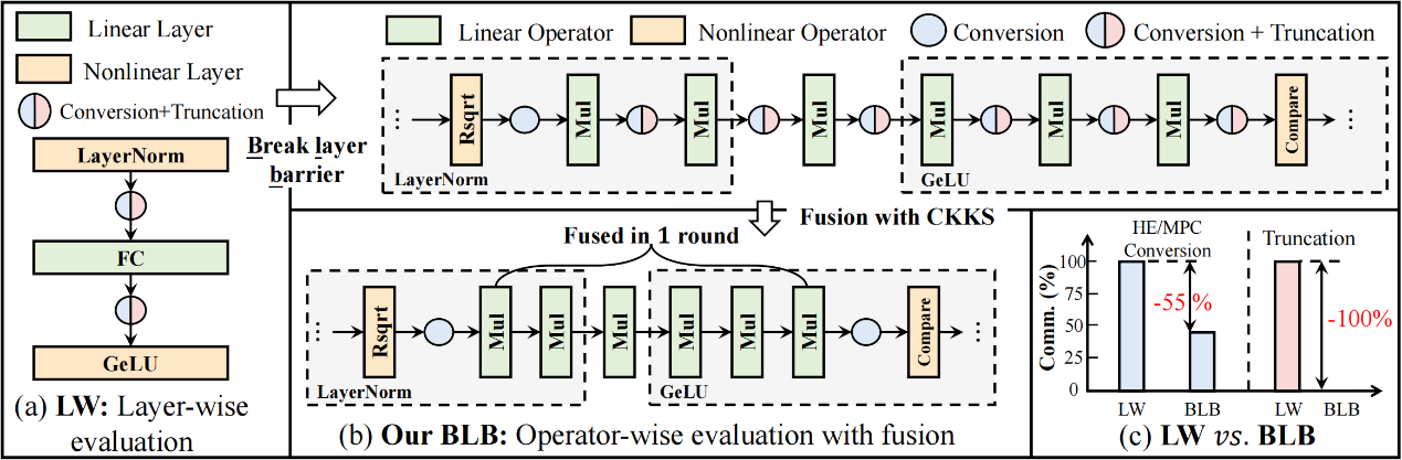 在人工智能大模型快速发展的今天,如何在保护用户隐私的同时高效运行 Transformer 模型,已成为学术界与产业界共同关注的前沿问题。用户的输入数据往往涉及医疗、金融、语音等高度敏感的内容,而大模型的参数本身则是企业的核心资产。如何做到“既能用,又安全”,是隐私计算研究必须解决的关键挑战。然而,现有的隐私推理框架往往依赖同态加密(HE)处理线性层、依赖多方安全计算(MPC)处理非线性层,不可避免地引入频繁的协议切换与通信,导致开销居高不下。以往的工作虽然尝试在层与层之间进行有限的融合,但受制于密文比特宽度膨胀和运算协议效率不足,其提升效果仍相对有限。