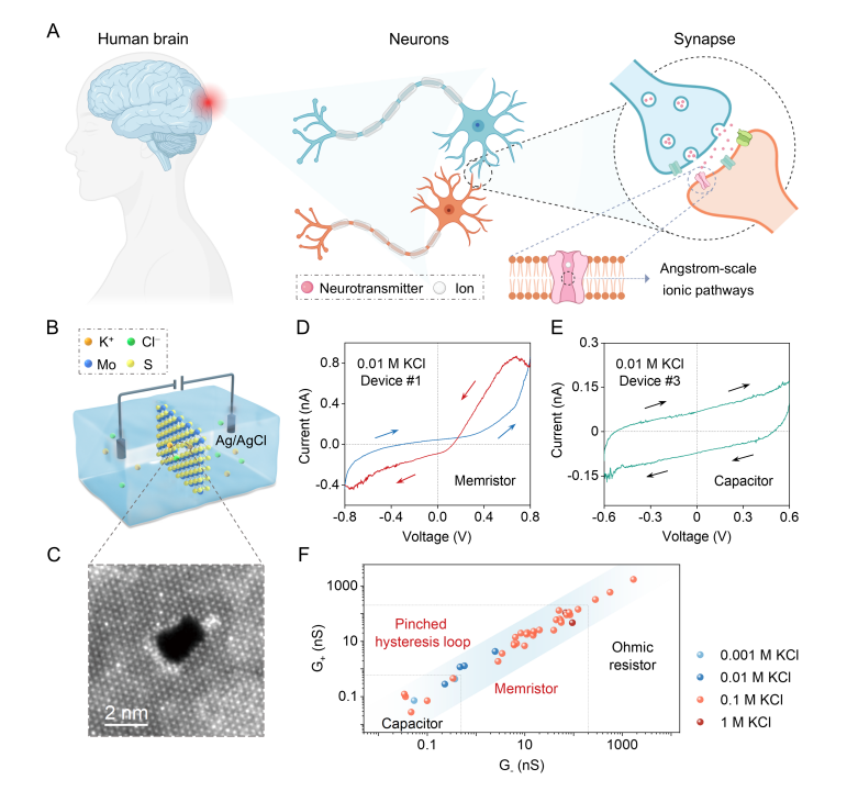 在并行性、连续性、低功耗的智能计算架构的需求背景下,基于模拟生物突触的仿生神经形态器件有望实现类脑信息处理范式,逐渐成为众多研究者关注的热点领域。纳流体忆阻器利用水相环境的离子作为载流子,具有表面性质可调、生物兼容性好等优点,在神经形态突触应用及脑机接口等领域具有广泛的应用前景。但是,现有纳流体忆阻器通道长度基本在微米尺寸,存在着输运效率低、能耗大及难以规模化加工等问题,且无法从结构上实现对(亚)纳米长离子通道的精准仿生设计,器件设计方面的不成熟制约了纳流体忆阻器更深层次的发展及应用。原子级厚度的石墨烯等二维材料具备优异的稳定性和加工简单等优点,为基于纳流体忆阻器的神经形态应用研究提供了崭新平台。