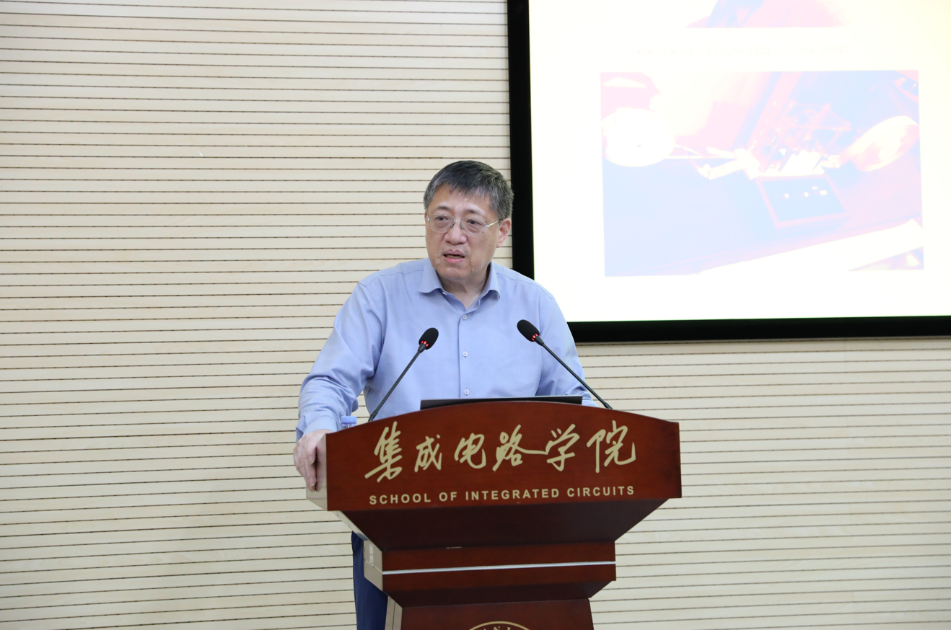 随后,校友代表、长江存储科技有限责任公司首席技术官,集团执行副总裁,研发中心负责人翟宗亮先生致辞。他鼓励毕业生怀抱大志,投身集成电路产业,自信面对挑战,持之以恒学习,成为兼容并蓄的行业精英,为国家科技进步添砖加瓦。